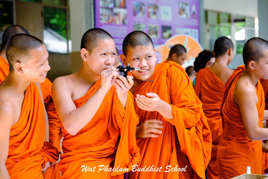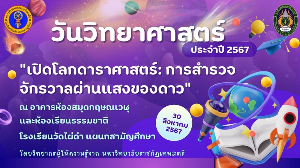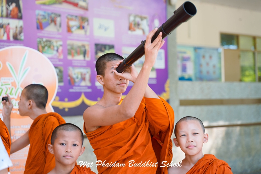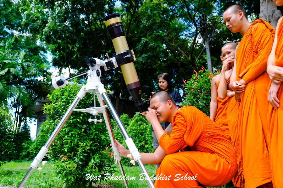 กิจกรรมวันวิทยาศาสตร์ ประจำปีการศึกษา ๒๕๖๗ โดย กลุ่มสาระการเรียนรู้วิทยาศาสตร์และเทคโนโลยี ในการนี้ คณาจารย์จากมหาวิทยาลัยราชภัฏเทพสตรี นำโดย ผศ.ดร.วัลย์ลิกา สุขสำราญ อาจารย์ประจำคณะวิทยาศาสตร์และเทคโนโลยี และนายสุชาติ เหลาหอม นายสุระพล เขียวหวาน นางสาวสุกัญญา จำปาทิพย์ นักวิทยาศาสตร์ ศูนย์วิทยาศาสตร์ ได้ถวายความรู้แด่สามเณรนักเรียน ตลอดทั้งภาคเช้าและภาคบ่าย โดยมีฐานกิจกรรมการเรียนรู้ ประกอบด้วย ๑. ทรงกลมท้องฟ้าและแผนที่ดาว ๒. กล้องโทรทัศน์และการประกอบกล้อง ๓. กล้องดูดวงอาทิตย์และนาฬิกาแดด |