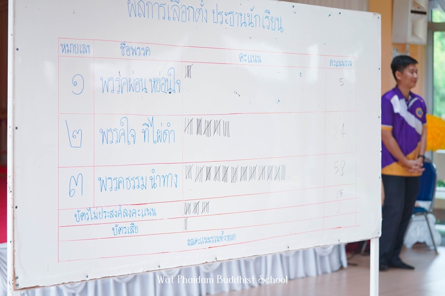 กิจกรรมเลือกตั้งคณะกรรมการสภานักเรียน โดย งานกิจการนักเรียน ฝ่ายบริหารงานทั่วไป พรรคผ่อนหย่อนใจ เบอร์ 1 ได้คะแนน 5 คะแนน พรรคใจที่ไผ่ดำ เบอร์ 2 ได้คะแนน 24 คะแนน พรรคธรรมนำทาง เบอร์ 3 ได้คะแนน 58 คะแนน _____________________________ ไม่ประสงค์ลงคะแนน 15 คะแนน บัตรเสีย 2 บัตร _____________________________ พรรคธรรมนำทาง เบอร์ 3 ชนะการเลือกตั้ง โดยมี สามเณรสมหมาย เบ้าคำ เป็นประธานนักเรียน สามเณรสมหวัง เบ้าคำ เป็นรองประธานนักเรียน สามเณรภัทรผล พสธรธนภัค ป. เป็นเลขานุการ |