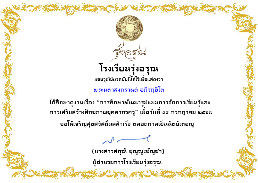 โรงเรียนรุ่งอรุณ มอบวุฒิบัตรฉบับนี้ให้ไว้เพื่อแสดงว่า พระมหาสงกรานต์ อภิรกฺขิโต