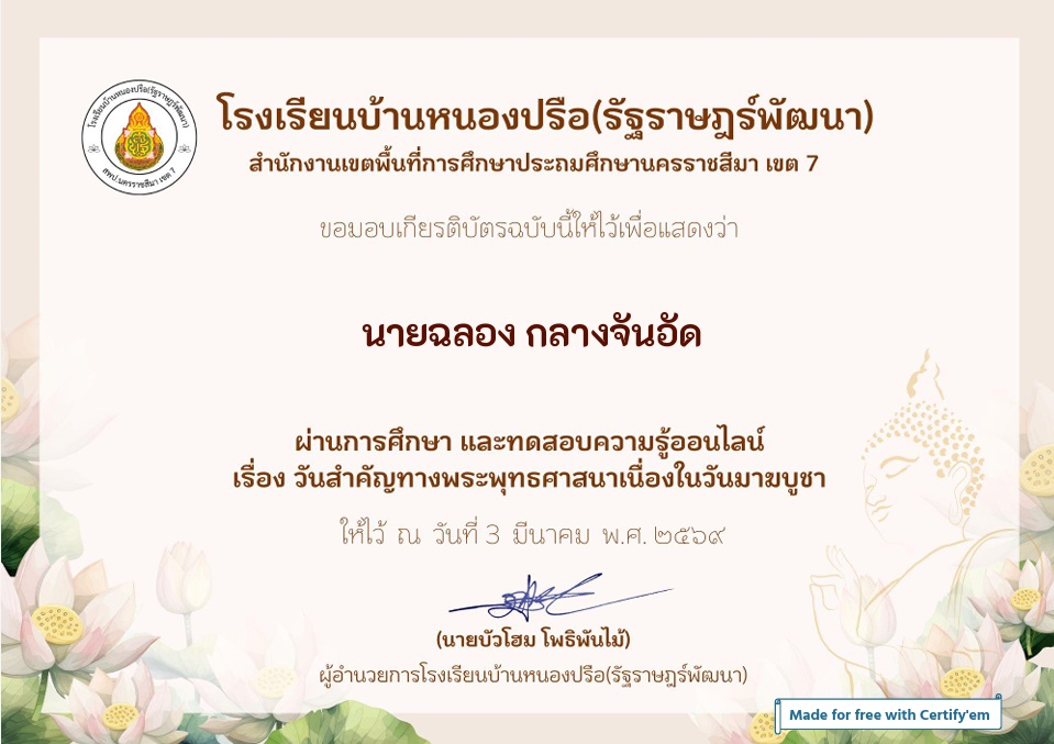 โรงเรียนบ้านหนองปรือ(รัฐราษฎร์พัฒนา) สำนักงานเขตพื้นการศึกษาประถมศึกษานครราชสีมา เขต ๗ ขอมอบเกียรติบัตรฉบับนี้ให้ไว้เพื่อแสดงว่า