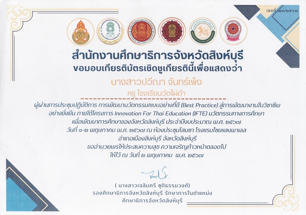 ๐๒-๐๕-๖๗ - การพัฒนานวัตกรรม/แบบอย่างที่ดี (Best Practcie) สู่การพัฒนางานในวิชาชีพ |