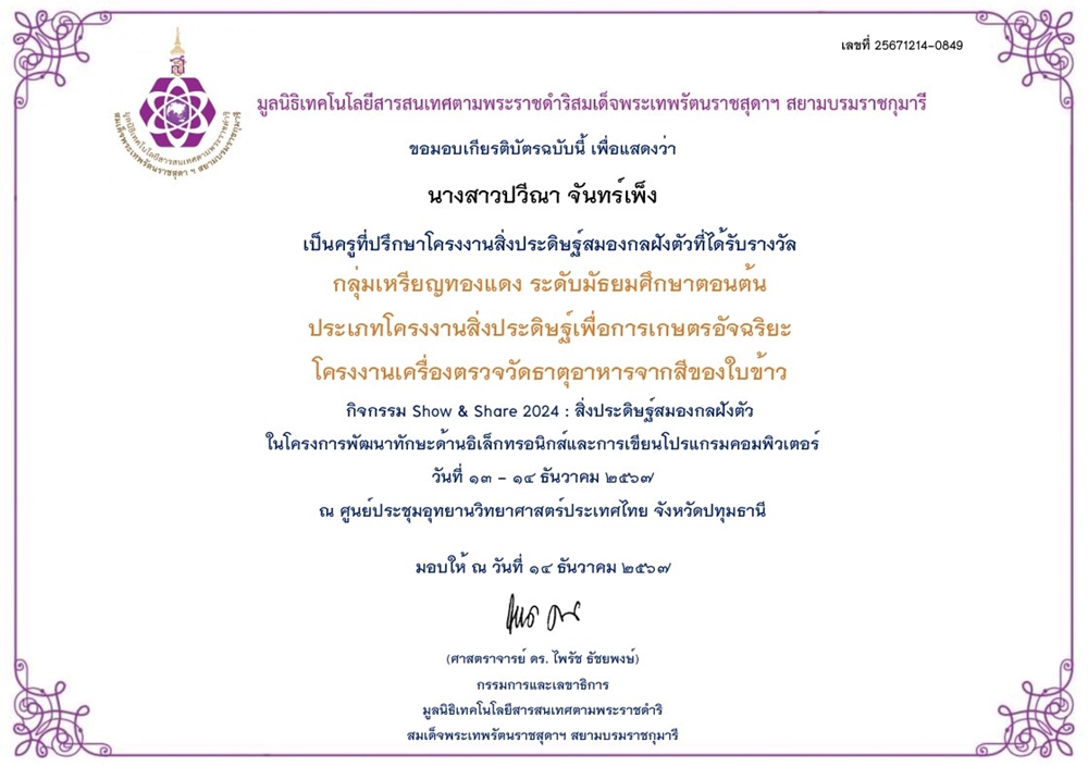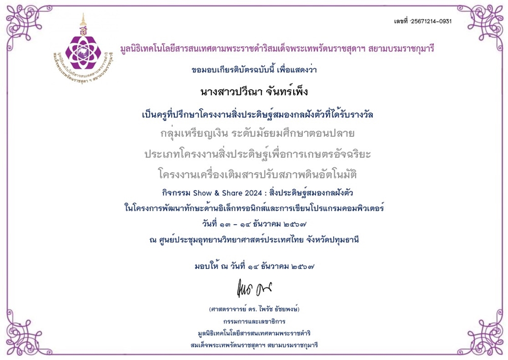 ๑๔-๑๒-๖๗ - เป็นครูที่ปรึกษาโครงงานสิ่งประดิษฐ์สมองกลฝังตัว |