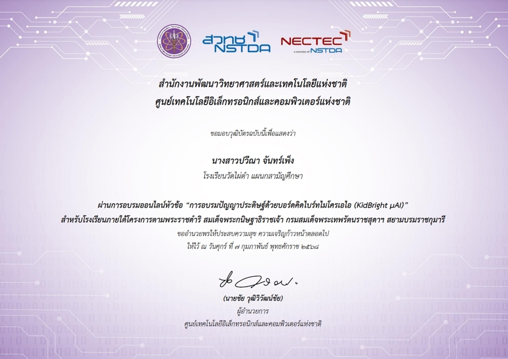๐๗-๐๒-๖๘ - ผ่านการอบรมออนไลน์หัวข้อ "การอบรมปัญญาประดิษฐ์ด้วยบอร์ดคิดไบร์ทไมโครเอไอ (KidBright uAI) |