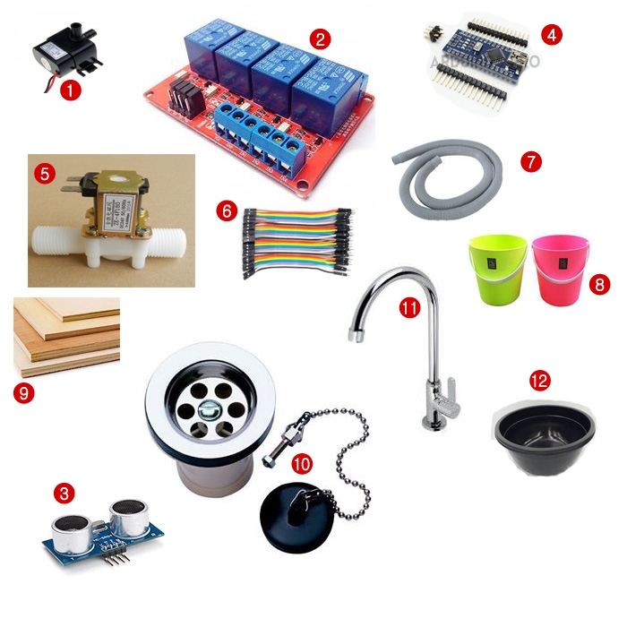 ๑.ปั้มน้ำ DC ขนาดเล็กรายละเอียด ปั๊มน้ำ DC Brushless ขนาดเล็ก อายุการใช้งาน 30,000 ชม สามารถทำงานต่อเนื่องกันเป็นเวลานานได้ โดยไม่ต้องมีการบำรุงรักษากันน้ำ สามารถทำงานใต้น้ำได้ ช่วงอุณหภูมิที่สามารถใช้งานได้ 0-75C ประหยัดพลังงาน กินไฟน้อย(4.8w) สามารถใช้ปั๊มของเหลว เช่นน้ำมัน หรือสารละลายอัลคาไลน์ได้ ๒.รีเลย์ ๔ ชาแนล โมดูลรีเลย์ ๔ ช่อง 5V (4 Channel Relay Module) เป็นโมดูลที่ใช้ควบคุมโหลดได้ทั้งแรงดันไฟฟ้า DC และ AC ซึ่งโหลดสูงสุด (Maximum Load) คือ AC 250V/10A, DC 30V/10A โดยใช้สัญญาณในการควบคุมการทำงานด้วยสัญญาณโลจิก TTL ทำงานด้วยสัญญาณแบบ Active Low, กระแสขับรีเลย์ (Drive Current) 15-20mA., มีการออกแบบให้เป็น Isolate ด้วย Optocoupler, มี LED แสดงสถานะ Relay สามารถนำไปประยุกต์ใช้งาน PLC Control, บ้านอัจฉริยะ,ใช้ในโรงงานอุตสาหกรรมหรืองานอื่นๆ ขึ้นอยู่กับการเขียนโปรแกรมและการต่อใช้งานภายนอก สามารถเชื่อมต่อใช้งานกับบอร์ด Rasberry Pi, Arduino, ARM, MCS-51, AVR, PIC, 8051, DSP, MSP430, TTL logic ๓.อันตร้าโซนิค เซนเซอร์ คืออุปกรณ์ที่ใช้ในการวัดระยะห่างเริ่มจากหัววัดของเซนเซอร์ถึงสิ่งของต่างๆได้อย่างแม่นยำ และข้อดีของอัลตร้าโซนิคเซนเซอร์เมื่อเทียบกับโฟโต้อิเล็กทริคเซนเซอร์แบบใช้วัดระยะทางก็คือ แม้แต่ในสภาวะที่ไม่เอื้ออำนวยเช่นฝุ่นผงและความสกปรก สามารถตรวจวัดระยะห่างของวัตถุได้ดีแม้ว่าวัตถุนั้นจะมีความโปร่งใส โปร่งแสง มีความแวววาวได้อย่างแม่นยำ และยังเหมาะสำหรับการตรวจจับของเหลวและวัตถุที่เป็นเม็ดได้เป็นอย่างดี เพื่อที่จะมารู้จักกับอัลตร้าโซนิคเซนเซอร์ ได้ดีขึ้น เรามารู้จัก กับคลื่นเสียงอัลตร้าโซนิคกันก่อน ๔. Arduino nano Arduino คือ บอร์ดไมโครคอนโทรลเลอร์สำเร็จรูป ที่รวมเอาตัวไมโครคอนโทรลเลอร์และอุปกรณ์อื่นๆที่จำเป็น มาในบอร์ดเดียว แถมยังเปิดเผยข้อมูลทุกๆอย่าง ทั้งลายวงจรและตัวอย่างโปรแกรม ทำให้ผู้ใช้สามารถนำไปพัฒนาต่อได้ง่าย เพียงแค่เรามีบอร์ด Arduino กับคอมพิวเตอร์อีกซักเครื่อง ก็พร้อมใช้งานได้แล้ว โดยที่ไม่ต้องมาปวดหัว กับการทำวงจรที่ซับซ้อน หรือการติดตั้งโปรแกรมที่ยุ่งยาก นำมาใช้สำหรับการควบคุมน้ำและน้ำยาอ่างล้างมือ