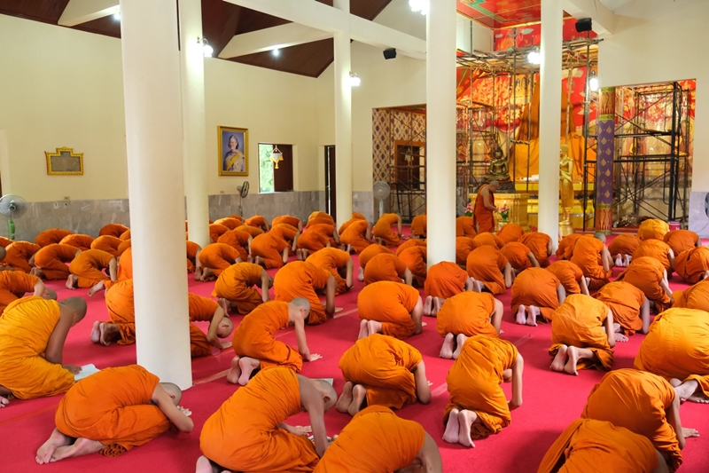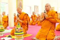 คณะสงฆ์องค์สามเณร ประกอบศาสนกิจในวันเข้าพรรษา โดยร่วมกันทำวัตรเย็น -กราบขอขมาโทษพระตรัยรัตน์