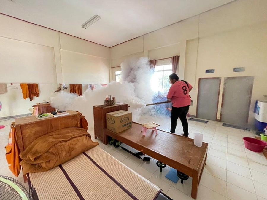 ร่วมกันฉีดพ่นหมอกควัน และ พ่นสารเคมีแบบละอองฝอย ( ULV) เพื่อกำจัดยุงตัวแก่ และรณรงค์กำจัดแหล่งเพาะพันธุ์ ลูกน้ำยุงลาย พร้อมพัฒนาสิ่งแวดล้อม