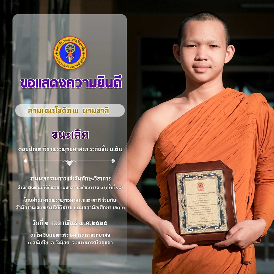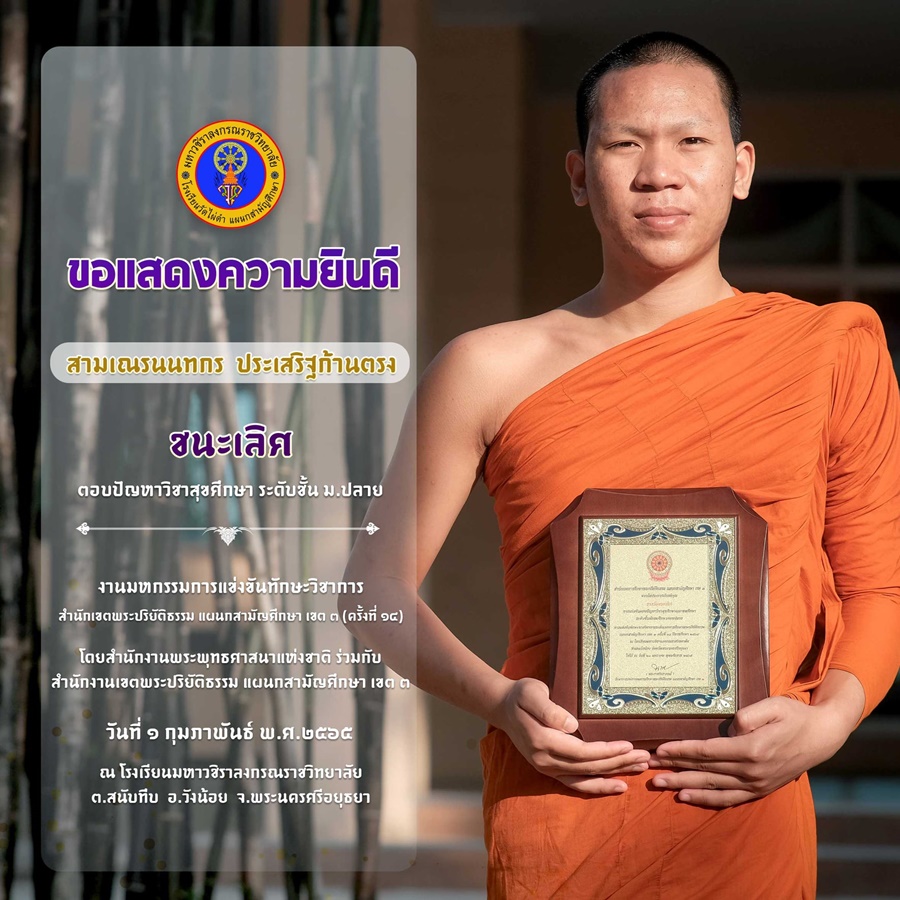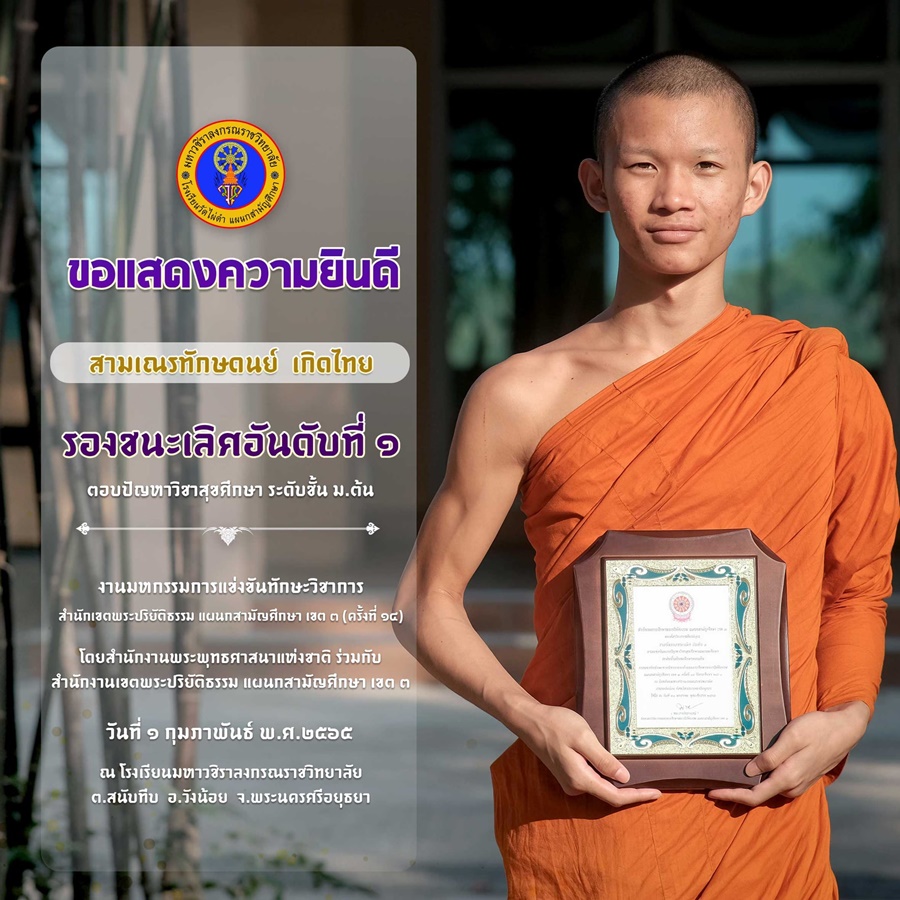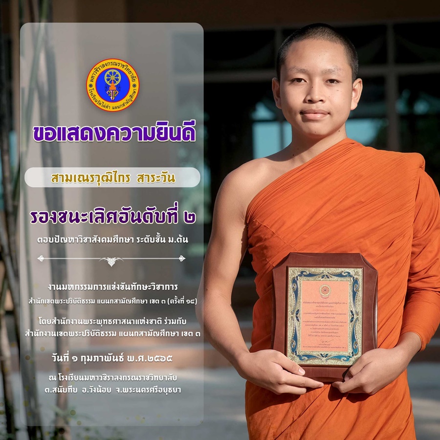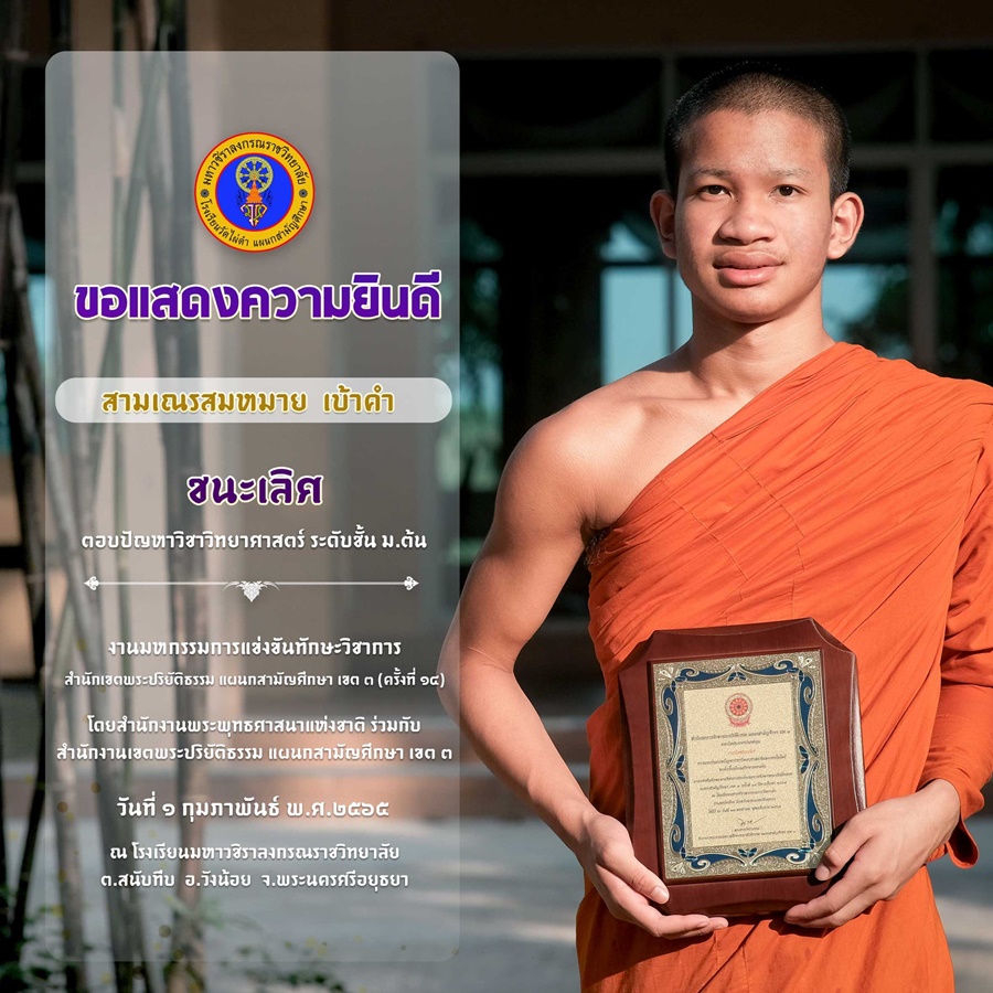 "เข้าร่วมแข่งขันทักษะวิชาการ ประจำปีการศึกษา 2564" งานมหกรรมการแข่งขันทักษะวิชาการ สำนักเขตพระปริยัติธรรม แผนกสามัญศึกษา เขต 3 (ครั้งที่ 14) ที่ได้รับรางวัลดังนี้ สามเณรโชติภพ นามชาลี ตอบปัญหาวิชาพระพุทธศาสนา ระดับชั้น ม.ต้น สามเณรกฤษณ์ อุกฤษณ์ ตอบปัญหาวิชาภาษาอังกฤษ ระดับชั้น ม.ต้น สามเณรสมหมาย เบ้าคำ ตอบปัญหาวิชาวิทยาศาสตร์ ระดับชั้น ม.ต้น สามเณรนนทกร ประเสริฐก้านตรง ตอบปัญหาวิชาสุขศึกษา ระดับชั้น ม.ปลาย สามเณรสหชาติ ถมคำ ตอบปัญหาวิชาศิลปะ ระดับชั้น ม.ปลาย สามเณรทักษดนย์ เกิดไทย ตอบปัญหาวิชาสุขศึกษา ระดับชั้น ม.ต้น สามเณรธราธร กอสัมพันธ์ ตอบปัญหาวิชาการงานอาชีพ ระดับชั้น ม.ต้น สามเณรวิทวัส เลาเฒ่า ตอบปัญหาวิชาการงานอาชีพ ระดับชั้น ม.ปลาย สามเณรสยมภู ภูอองทอง ตอบปัญหาวิชาภาษาอังกฤษ ระดับชั้น ม.ปลาย สามเณรวุฒิไกร สาระวัน ตอบปัญหาวิชาสังคมศึกษา ระดับชั้น ม.ต้น สามเณรโชติพงศ์ โคกโพธิ์ ตอบปัญหาวิชาคณิตศาสตร์ ระดับชั้น ม.ปลาย |