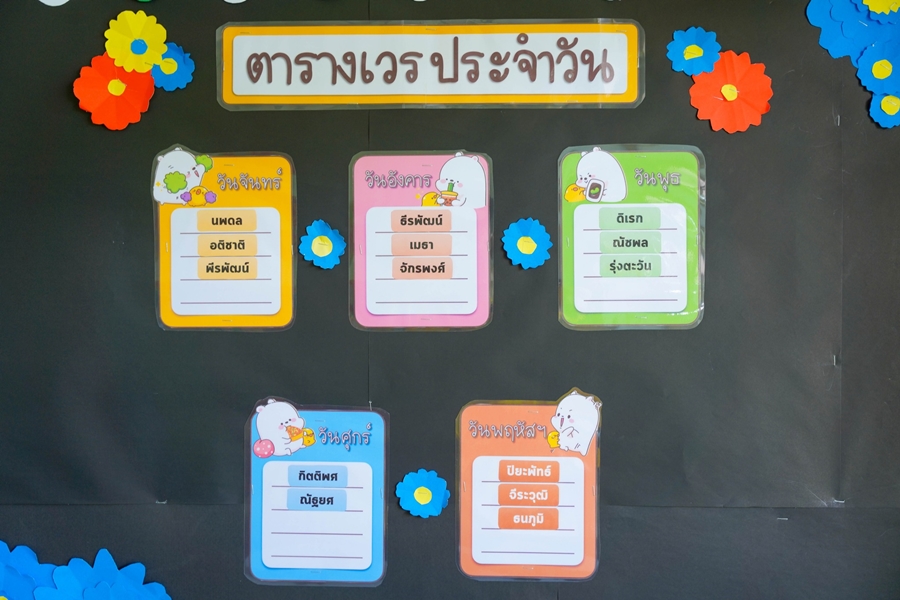 - จัดบอร์ดห้องของตัวเอง ยกเว้น ม.๕ จัดห้องคอมฯ และบอร์ดข้างบันไดฝั่งตะวันออก