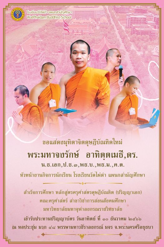 พระมหาจงรักษ์ อาทิตฺตเมธี, ดร. หัวหน้างานกิจการนักเรียน โรงเรียนวัดไผ่ดำ แผนกสามัญศึกษา พระนิสิตทุนพระราชทาน ใน สมเด็จพระกนิษฐาธิราชเจ้า กรมสมเด็จพระเทพรัตนราชสุดา ฯ สยามบรมราชกุมารี ในโอกาสเข้ารับประทานปริญญาบัตร ครุศาสตรดุษฎีบัณฑิต (สาขาวิชาการสอนสังคม) ประวัติโดยสังเขป พระมหาจงรักษ์ อาทิตฺตเมธี นามสกุล ภูพิษ เกิดวันอาทิตย์ ที่ ๒๖ เดือนมิถุนายน พ.ศ. ๒๕๓๗ ภูมิลำเนาเดิม ๖๖ หมู่ ๑๑ บ้านวังน้ำเย็น ตำบลวังสะพุง อำเภอวังสะพุง จังหวัดเลย ๔๒๑๓๐ สังกัด วัดกฤษณเวฬุพุทธาราม ตำบลทองเอน อำเภออินทร์บุรี จังหวัดสิงห์บุรี ๑๖๑๑๐ หน้าที่การงาน - พระสอนศีลธรรม โรงเรียนทองเอนวิทยา อ.อินทร์บุรี จ.สิงห์บุรี สังกัดมหาวิทยาลัยมหามกุฎราชวิทยาลัย - ครูสอนนักธรรม – บาลี สำนักศาสนศึกษาวัดกฤษณเวฬุพุทธาราม อ.อินทร์บุรี จ.สิงห์บุรี - ครูสอนปริยัติสามัญ โรงเรียนวัดไผ่ดำ แผนกสามัญศึกษา อ.อินทร์บุรี จ.สิงห์บุรี ประวัติการศึกษา พ.ศ.๒๕๔๙ สำเร็จการศึกษาระดับชั้นประถมศึกษาปีที่ ๖ จากโรงเรียนชุมชนวังสะพุง พ.ศ.๒๕๕๒ สอบไล่ได้ นักธรรมชั้นเอก พ.ศ.๒๕๕๗ สอบไล่ได้ เปรียญธรรม ๓ ประโยค พ.ศ.๒๕๕๕ สำเร็จการศึกษาระดับชั้นมัธยมศึกษาปีที่ ๖ จากโรงเรียนวัดไผ่ดำ แผนกสามัญศึกษา จังหวัดสิงห์บุรี พ.ศ.๒๕๖๐ สำเร็จการศึกษาปริญญาตรี หลักสูตรพุทธศาสตรบัณฑิต พ.ศ.๒๕๖๓ สำเร็จการศึกษาปริญญาโท หลักสูตรพุทธศาสตรมหาบัณฑิต พ.ศ.๒๕๖๖ สำเร็จการศึกษาปริญญาเอก หลักสูตรครุศาสตรดุษฎีบัณฑิต