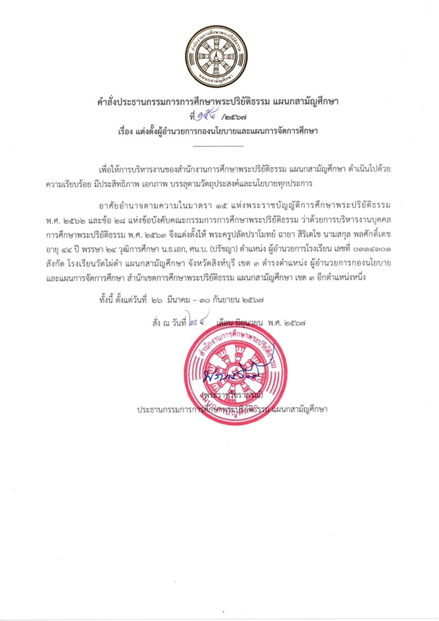 คำสั่งประธานกรรมการการศึกษาพระปริยัติธรรม แผนกสามัญศึกษา ที่ ๑๕๔ / ๒๕๖๗ เรื่อง แต่งตั้งผู้อำนวยการกองนโยบายและแผนการจัดการศึกษา __________________________________________________ แต่งตั้งให้ พระครูปลัด ปราโมทย์ สิริเตโช (พลศักดิ์เดช) อายุ ๔๕ ปี พรรษา ๒๕ วุฒิการศึกษา น.ธ.เอก, ศน.บ.(ปรัชญา) ตำแหน่งผู้อำนวยการโรงเรียนวัดไผ่ดำ แผนกสามัญศึกษา ดำรงตำแหน่ง ผู้อำนวยการกองนโยบายและแผนการจัดการศึกษา สำนักเขตการศึกษาพระปริยัติธรรม แผนกสามัญศึกษา เขต ๓ ตั้งแต่วันที่ ๒๖ มีนาคม - ๓๐ กันยายน ๒๕๖๗ สั่ง ณ วันที่ ๒๔ มิถุนายน พ.ศ. ๒๕๖๗ |