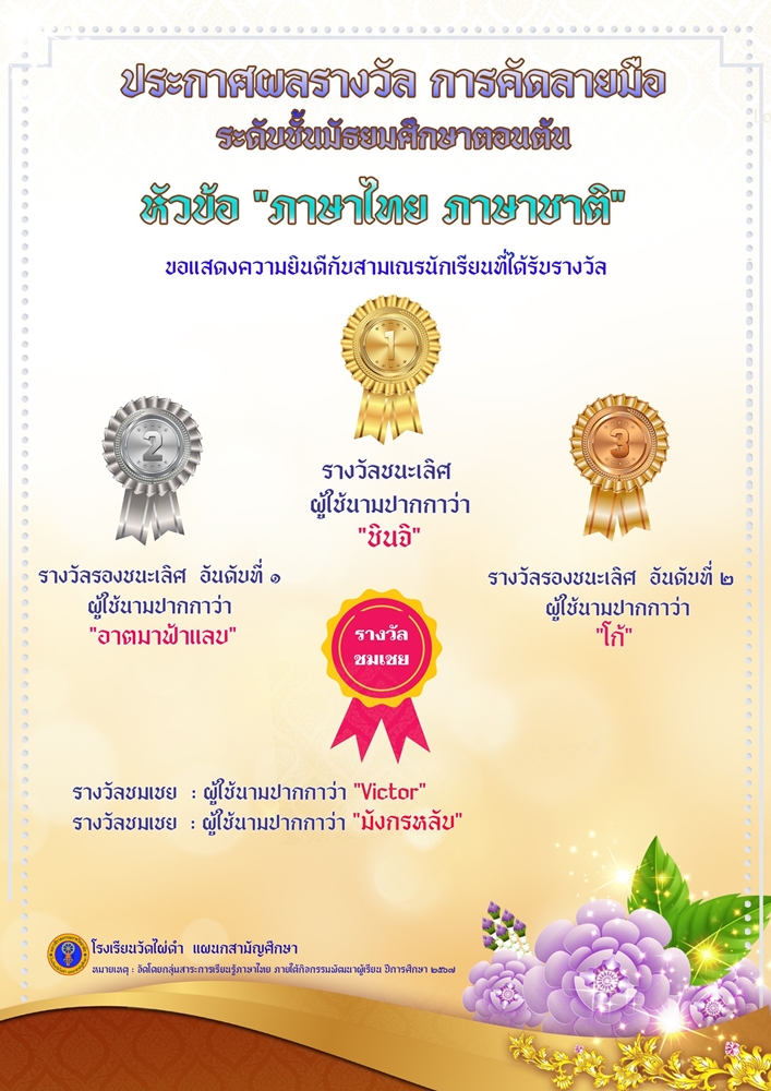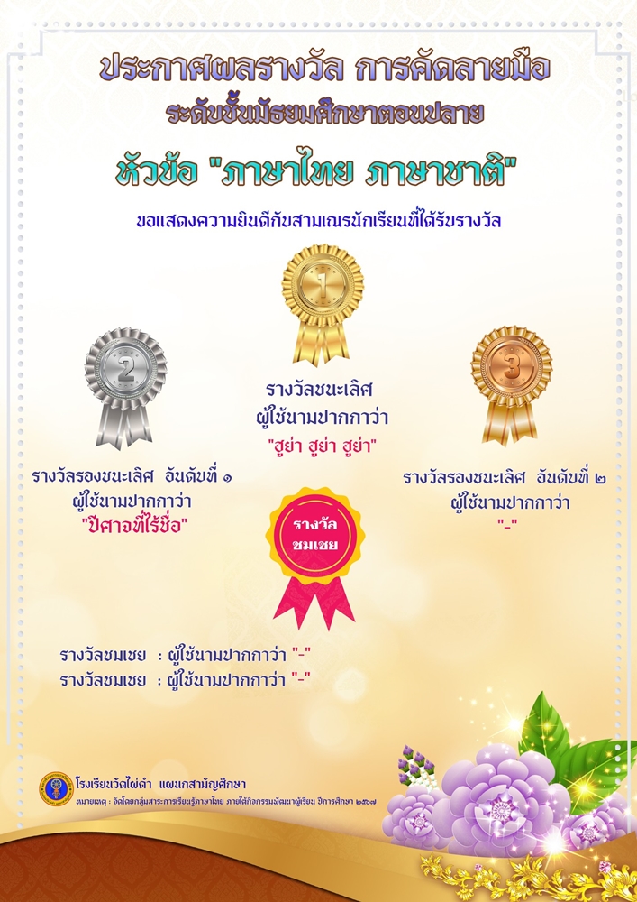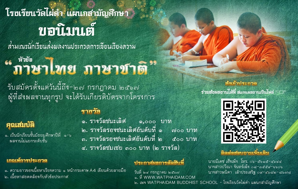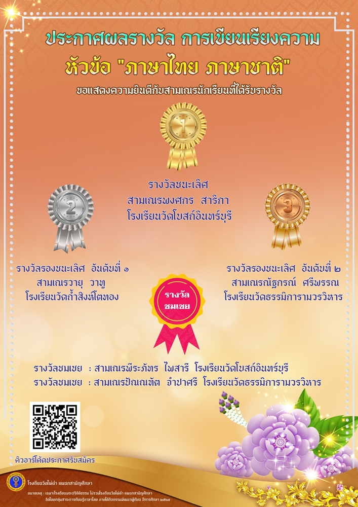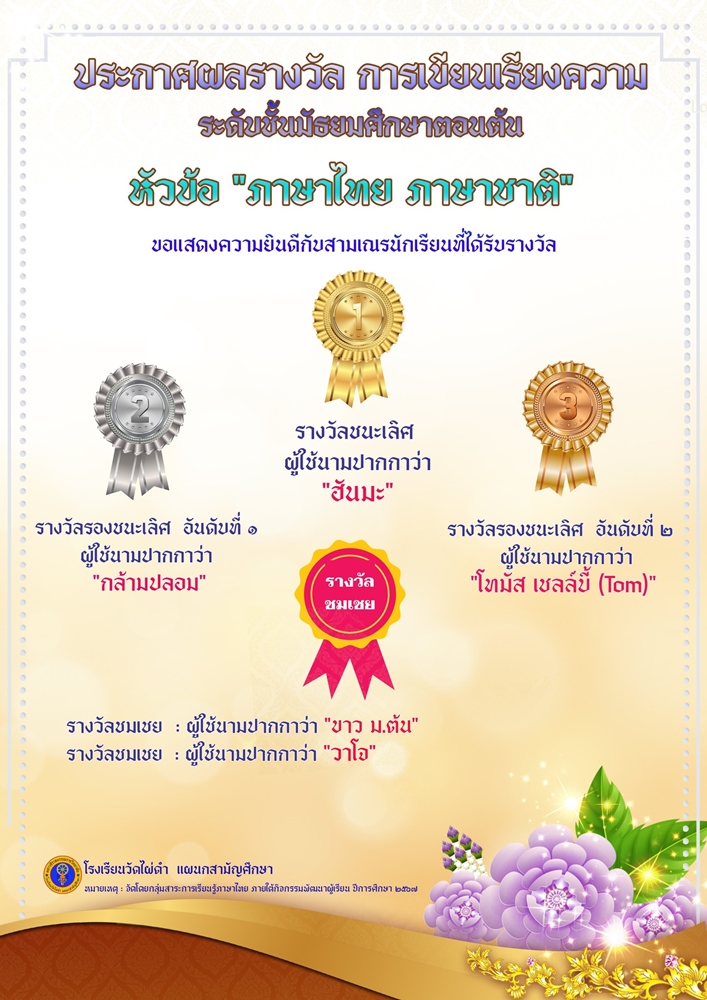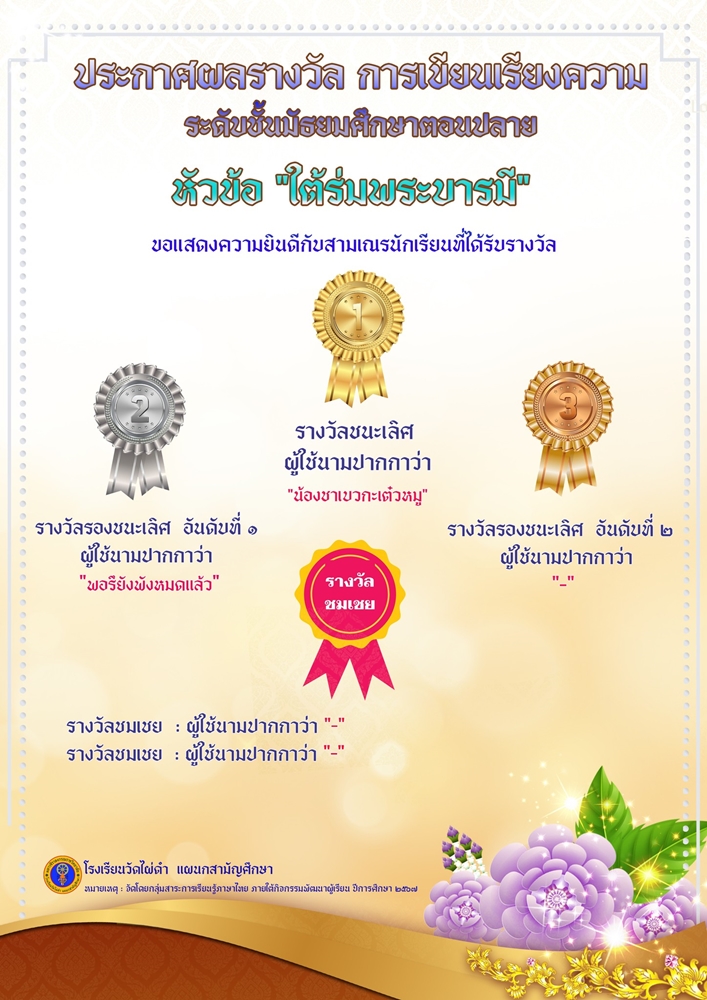 ประกาศผลรางวัล กิจกรรม "ภาษาไทย ภาษาชาติ" ประเภทรางวัล (สหโรงเรียน) รางวัลชนะเลิศ ได้แก่ สามเณรพงศกร สาริกา โรงเรียนวัดโบสถ์อินทร์บุรี รางวัลรองชนะเลิศอันดับที่ ๑ ได้แก่ สามเณรวายุ วาทู โรงเรียนวัดถ้ำสิงห์โตทอง รางวัลรองชนะเลิศอันดับที่ ๒ ได้แก่ สามเณรณัฐกรณ์ ศรีพรรณ โรงเรียนวัดธรรมิการามวรวิหาร รางวัลชมเชย ได้แก่ สามเณรพีระภัทร ไพสารี โรงเรียนวัดโบสถ์อินทร์บุรี และสามเณรปัณณทัต จำปาศรี โรงเรียนวัดธรรมิการามวรวิหาร ประเภทรางวัล (โรงเรียนวัดไผ่ดำ) การเขียนเรียงความ ม.ปลาย หัวข้อ "ใต้ร่มพระบารมี" รางวัลชนะเลิศ ได้แก่ ผู้ใช้นามปากกา "น้องชาเขวกะเต๋วหมู" รางวัลรองชนะเลิศอันดับที่ ๑ ได้แก่ ผู้ใช้นามปากกา "พอรึยังพังหมดแล้ว" รางวัลรองชนะเลิศอันดับที่ ๒ ได้แก่ ผู้ใช้นามปากกา "-" การเรียงความ ม.ต้น หัวข้อ "ภาษาไทย ภาษาชาติ" รางวัลชนะเลิศ ได้แก่ ผู้ใช้นามปากกา "ฮันมะ" รางวัลรองชนะเลิศอันดับที่ ๑ ได้แก่ ผู้ใช้นามปากกา "กล้ามปลอม" รางวัลรองชนะเลิศอันดับที่ ๒ ได้แก่ ผู้ใช้นามปากกา "โทมัส เชลล์บี้ (Tom)" การคัดลายมือ ม.ปลาย หัวข้อ "ภาษาไทย ภาษาชาติ" รางวัลชนะเลิศ ได้แก่ ผู้ใช้นามปากกา "ฮูย่า ฮูย่า ฮูย่า" รางวัลรองชนะเลิศอันดับที่ ๑ ได้แก่ ผู้ใช้นามปากกา "ปีศาจที่ใร้ชื่อ" รางวัลรองชนะเลิศอันดับที่ ๒ ได้แก่ ผู้ใช้นามปากกา "-" การคัดลายมือ ม.ต้น หัวข้อ "ภาษาไทย ภาษาชาติ" รางวัลชนะเลิศ ได้แก่ ผู้ใช้นามปากกา "ชินจิ" รางวัลรองชนะเลิศอันดับที่ ๑ ได้แก่ ผู้ใช้นามปากกา "อาตมาฟ้าแลบ" รางวัลรองชนะเลิศอันดับที่ ๒ ได้แก่ ผู้ใช้นามปากกา "โก้" |