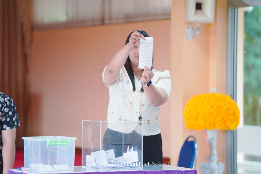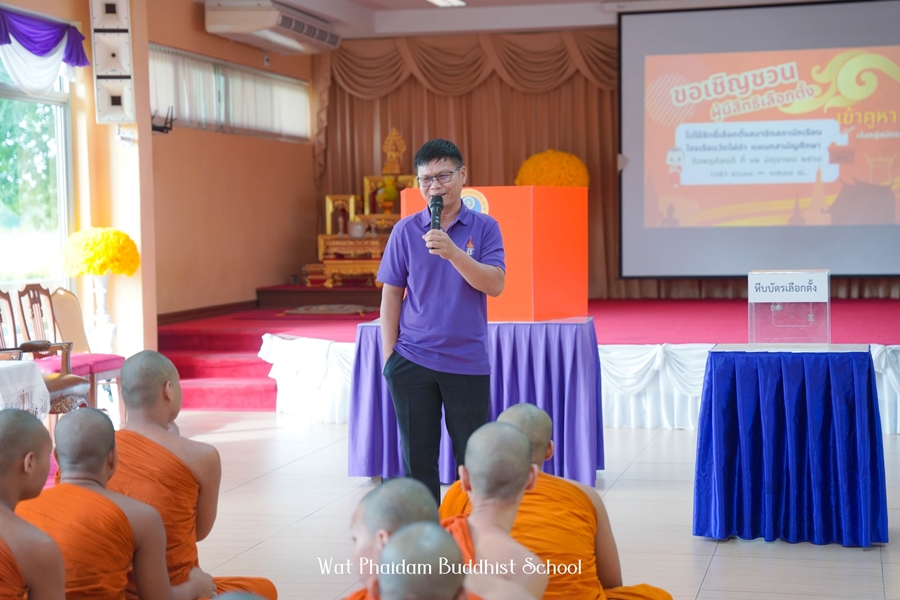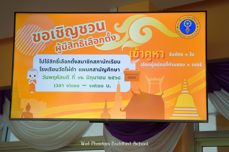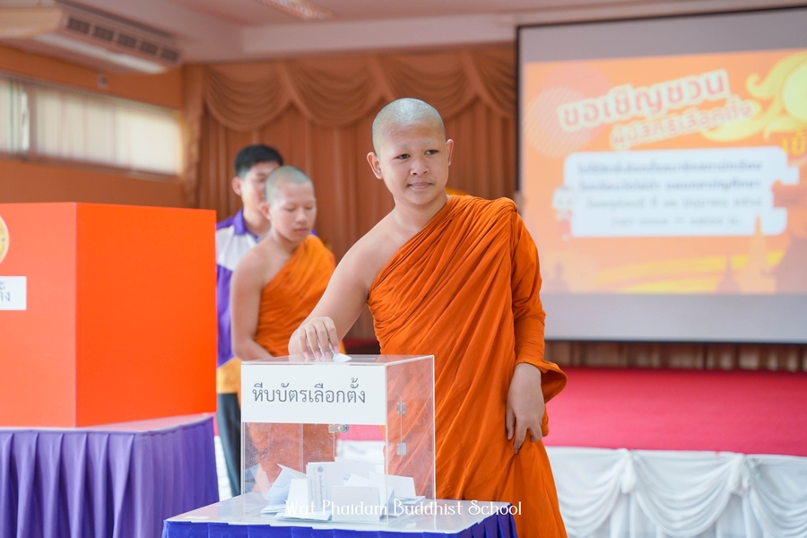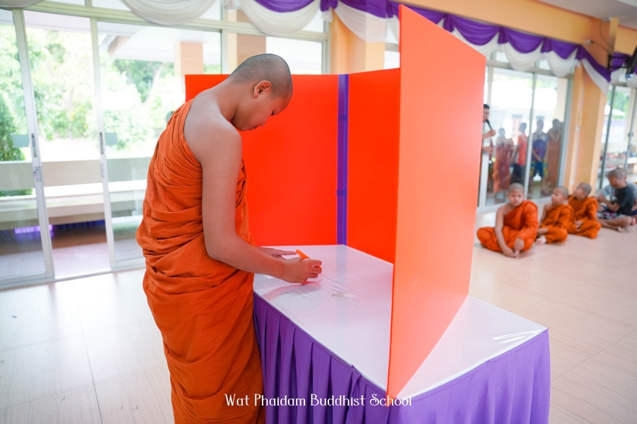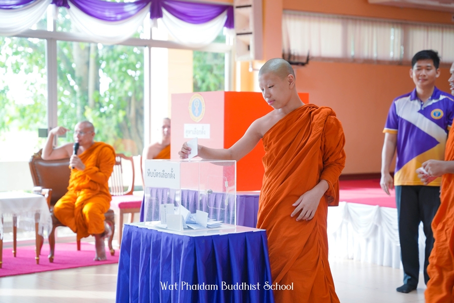กิจกรรมเลือกตั้งคณะกรรมการสภานักเรียน โดย งานกิจการนักเรียน ฝ่ายบริหารงานทั่วไป พรรคผ่อนหย่อนใจ เบอร์ 1 ได้คะแนน 5 คะแนน พรรคใจที่ไผ่ดำ เบอร์ 2 ได้คะแนน 24 คะแนน พรรคธรรมนำทาง เบอร์ 3 ได้คะแนน 58 คะแนน _____________________________ ไม่ประสงค์ลงคะแนน 15 คะแนน บัตรเสีย 2 บัตร _____________________________ พรรคธรรมนำทาง เบอร์ 3 ชนะการเลือกตั้ง โดยมี สามเณรสมหมาย เบ้าคำ เป็นประธานนักเรียน สามเณรสมหวัง เบ้าคำ เป็นรองประธานนักเรียน สามเณรภัทรผล พสธรธนภัค ป. เป็นเลขานุการ |