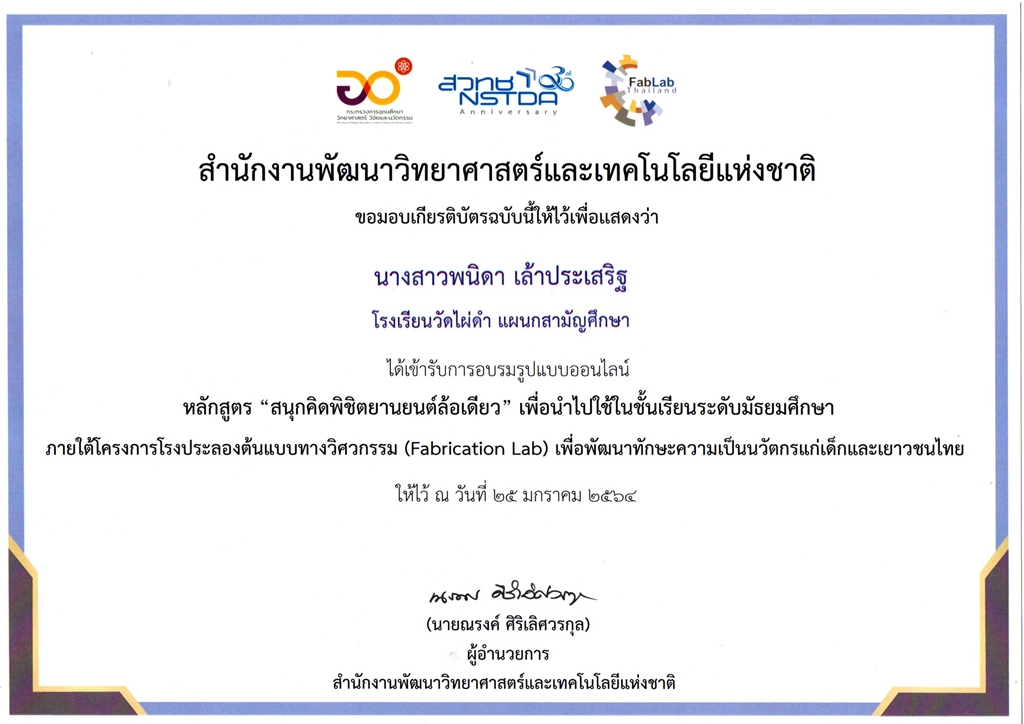 สำนักงานพัฒนาวิทยาศาสตร์และเทคโนโลยีแห่งชาติ ได้มอบเกียรติบัตรให้แก่ นางสาวพนิดา เล้าประเสริฐ
