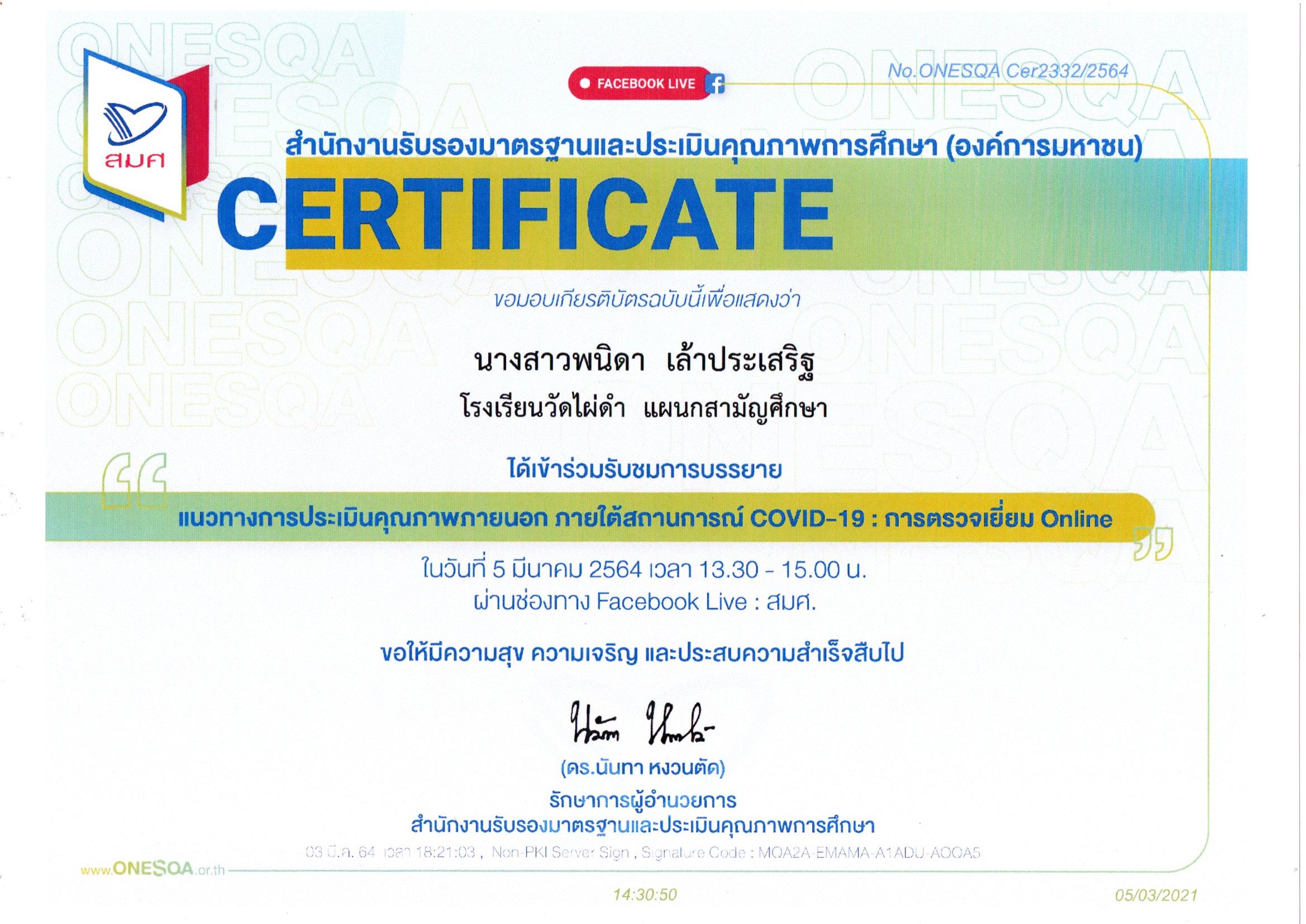 สำนักงานรับรองมาตรฐานและประเมินคุณภาพการศึกษา (องค์การมหาชน) CERTIFICATE มอบเกียรติบัตรฉบับนี้เพื่อแสดงว่า นางสาวพนิดา เล้าประเสริฐ โรงเรียนวัดไผ่ดำ แผนกสามัญศึกษา ได้เข้าร่วมรับชมการบรรยาย แนวทางการประเมินคุณภาพภายนอก ภายใต้สถานการณ์ COVID-19 : การตรวจเยี่ยม ONline ในวันที่ ๕ มีนาคม ๒๕๖๔ เวลา ๑๓.๓๐ น. - ๑๕.๐๐ น. ผ่านช่องทาง Facebook Live : สมศ.