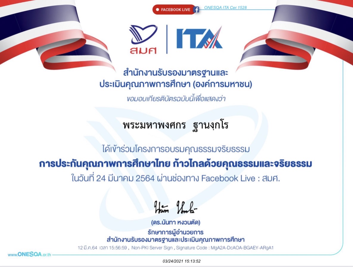 สำนักงานรับรองมาตรฐาน และ ประเมินคุณภาพการศึกษา (องค์การมหาชน) มอบเกียรติบัตรฉบับนี้เพื่อแสดงว่า พระมหาพงศกร ฐานงฺกโร
