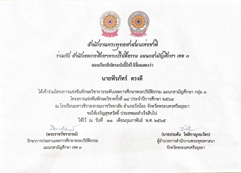 สำนักงานพระพุทธศาสนาแห่งชาติ ร่วมกับ สำนักเขตการศึกษาพระปริยัติธรรม แผนกสามัญศึกษา เขต 3 มอบเกียรติบัตรฉบับนี้ให้ไว้เพื่อแสดงว่า นายพีรภัทร์ ตรงดี