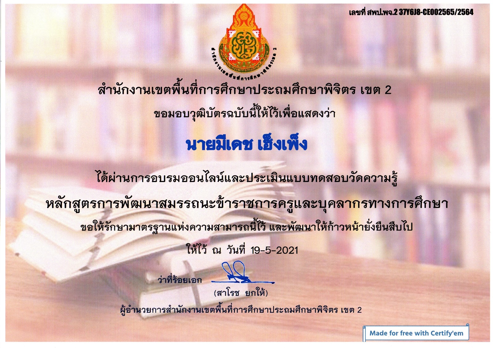 ขอมอบวุฒิบัตรฉบับนี้ให้ไว้เพื่อแสดงว่า