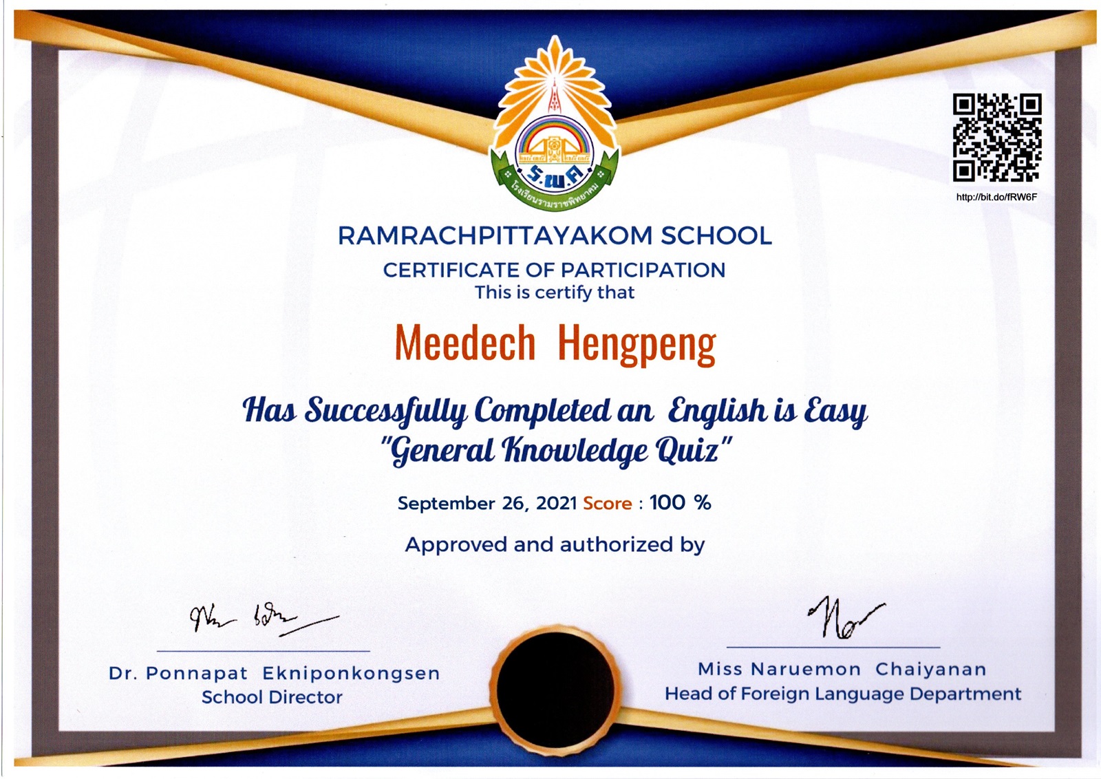 RAMRAHPITTAYAKOM SCHOOL CERTIFICATE OF PARTICIPATION This is certify that