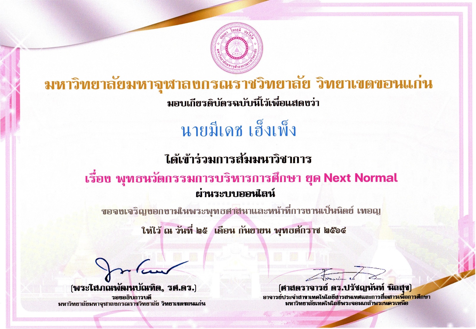มหาวิทยาลัยมหาจุฬาลงกรณราชวิทยาลัย วิทยาเขตขอนแก่น มอบเกียรติบัตรฉบับนี้ เพื่อแสดงว่า นายมีเดช เฮ็งเพ็ง