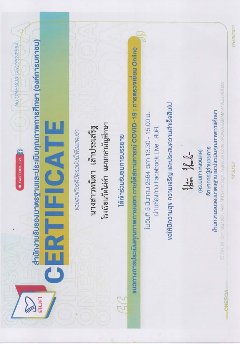 ได้เข้าร่วมรับชมการบรรยาย แนวทางการประเมินคุณภาพภายนอก ภายใต้สถานการณ์ Covid-19 : การตรวจเยี่ยม Online ผ่านช่องทาง Facebook Live : สมศ. |