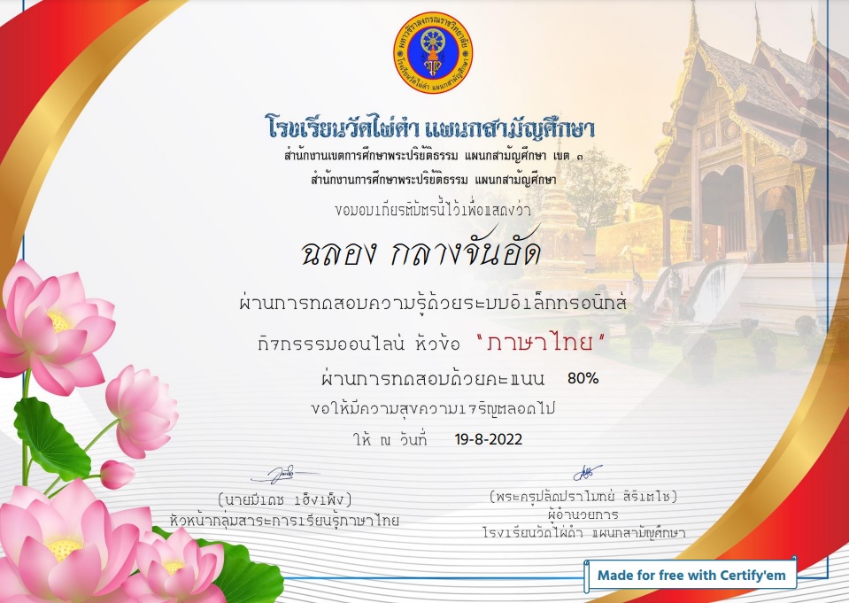 ชื่อผลงาน : 19-08-65 - ผ่านการทดสอบภาษาไทยออนไลน์