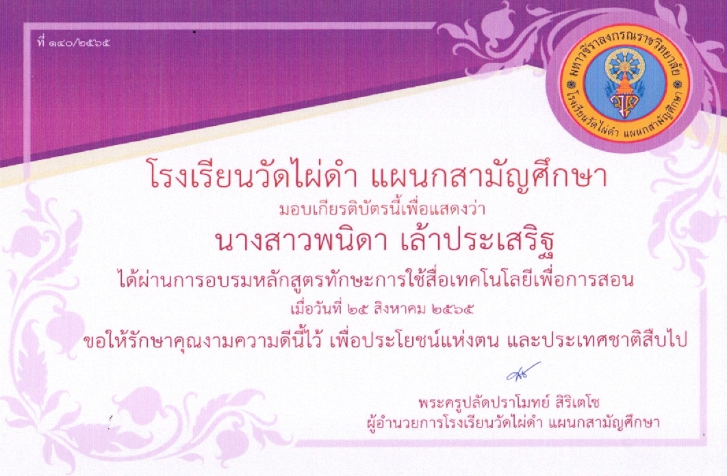 วันที่ ๒๕ สิงหาคม ๒๕๖๕ โรงเรียนวัดไผ่ดำ แผนกสามัญศึกษา ได้จัดอบรมหลักสูตรทักษะการใช้สื่อเทคโนโลยีเพื่อการสอน โดยใช้คอมพิวเตอร์ในรูปแบบออนไลน์ |