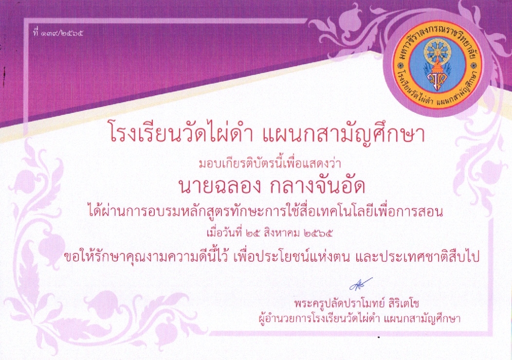 วันที่ ๒๕ สิงหาคม ๒๕๖๕ โรงเรียนวัดไผ่ดำ แผนกสามัญศึกษา ได้จัดอบรมหลักสูตรทักษะการใช้สื่อเทคโนโลยีเพื่อการสอน โดยใช้คอมพิวเตอร์ในรูปแบบออนไลน์ |