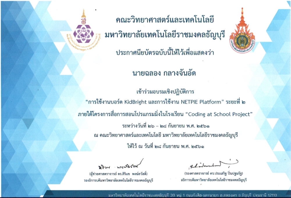 คณะวิทยาศาสตร์และเทคโนโลยี มหาวิทยาลัยเทคโนโลยีราชมงคลธัญบุรี ประกาศนียบัตรฉบับนี้ให้ไว้เพื่อแสดงว่า นายฉลอง กลางจันอัด เข้าร่วม อบรมเชิงปฎิบัติการ การใช้บอร์ด KidBright - NETPIE Platform ในโครงการสื่อการสอนโปรแกรมมิ่งในโรงเรียน "Coding at School Project" ระหว่างวันที่ ๒๖-๒๘ กันยายน ๒๕๖๑ ณ คณะวิทยาศาสตร์และเทคโนโลยี มหาวิทยาลัยเทคโนโลยีราชมงคลธัญบุรี |