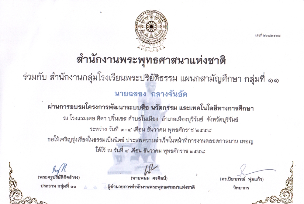 สำนักงานพระพุทธศาสนาแห่งชาติ ร่วมกับ สำนักงานกลุ่มโรงเรียนพระปริยัติธรรม แผนกสามัญศึกษา กลุ่มที่ ๑๑ ประกาศนียบัตรฉบับนี้ให้ไว้เพื่อแสดงว่า นายฉลอง กลางจันอัด ผ่านการอบรมโครงการพัฒนาระบบสื่อ นวัตกรรม และเทคโนโลยีทางการศึกษา ณ โรงแรมเดอ ศิตา ปริ้นเซส ตำบลในเมือง อำเภอเมืองบุรีรัมย์ จังหวัดบุรีรัมย์ ระหว่างวันที่ ๓-๔ ธันวาคม ๒๕๕๘ พระครูปริยัติกิจธำรง ประธานกลุ่ม ๑๑ นายพนม ศรศิลป์ ผู้อำนวยการสำนักงานพระพุทธศาสนาแห่งชาติ ดร.ปิยาภรณ์ พุ่มแก้ว วิทยากร |