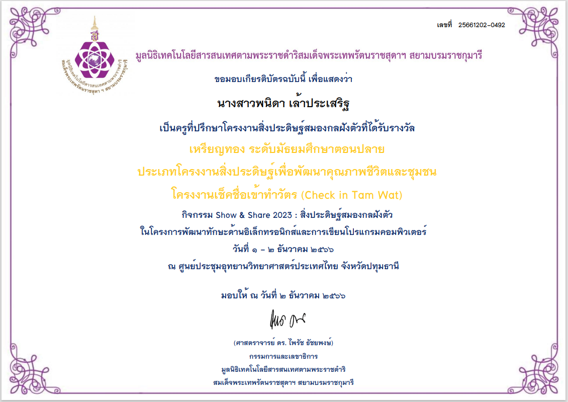 มูลนิธิเทคโนโลยีสารสนเทศตามพระราชดำริสมเด็จพระเทพรัตนราชสุดาฯ สยามบรมราชกุมารี ขอมอบเกียรติบัตรฉบับนี้ เพื่อแสดงว่า