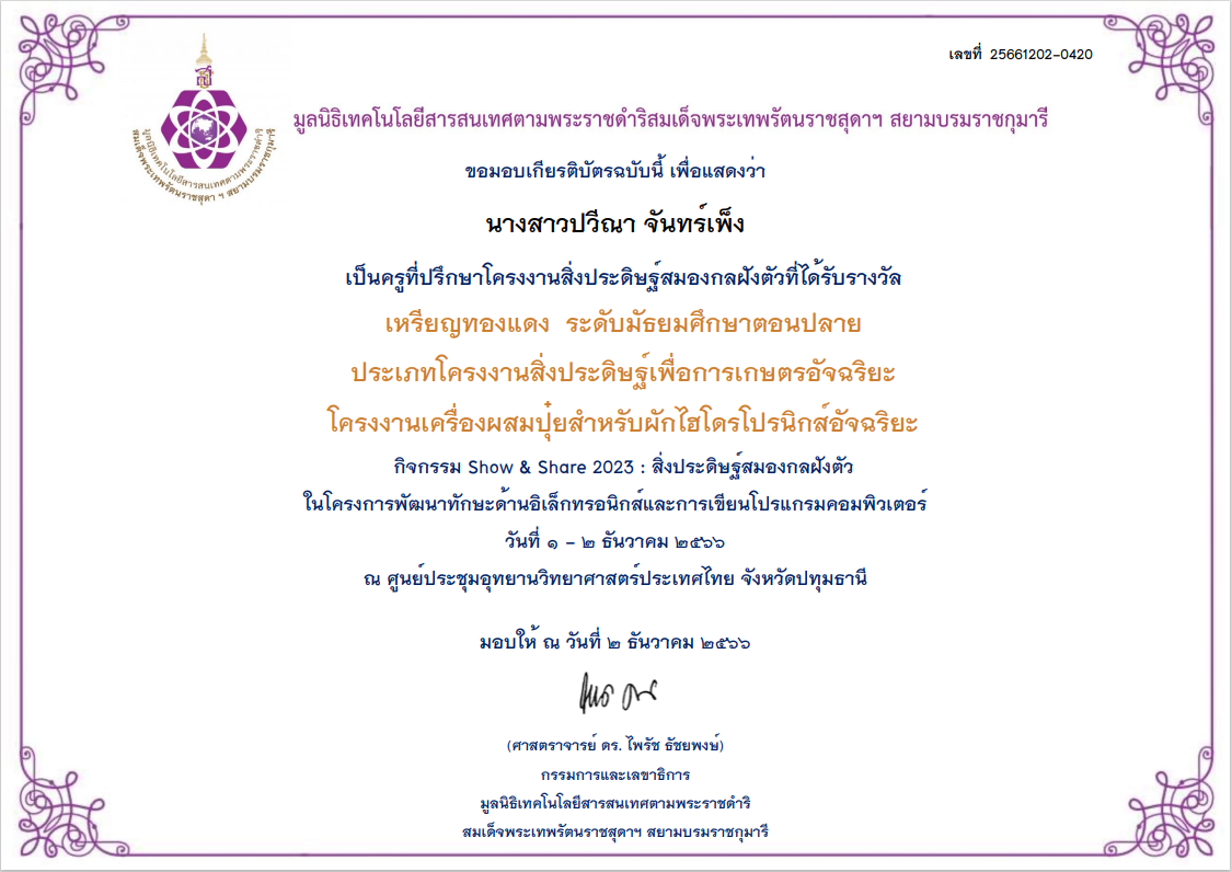 มูลนิธิเทคโนโลยีสารสนเทศตามพระราชดำริสมเด็จพระเทพรัตนราชสุดาฯ สยามบรมราชกุมารี ขอมอบเกียรติบัตรฉบับนี้ เพื่อแสดงว่า นางสาวปวีณา จันทร์เพ็ง