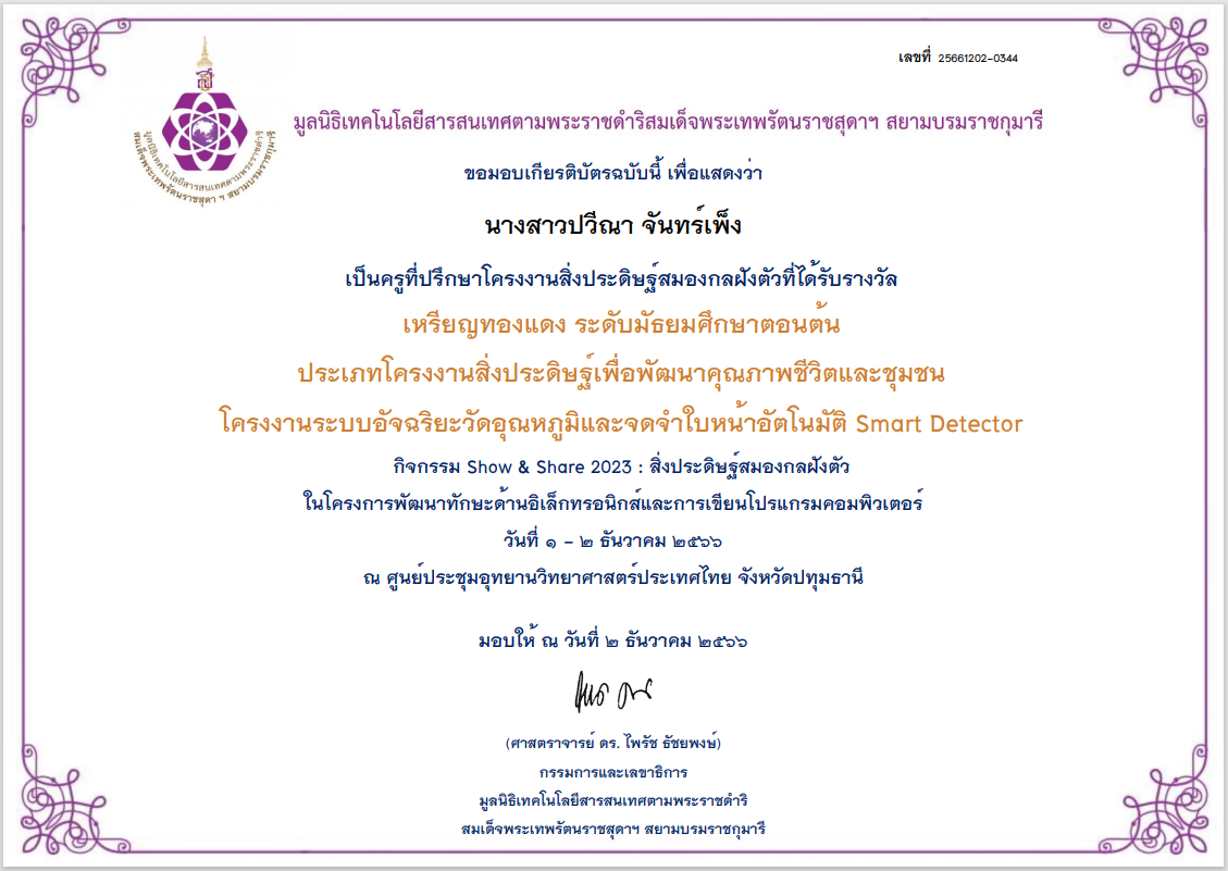 มูลนิธิเทคโนโลยีสารสนเทศตามพระราชดำริสมเด็จพระเทพรัตนราชสุดาฯ สยามบรมราชกุมารี ขอมอบเกียรติบัตรฉบับนี้ เพื่อแสดงว่า