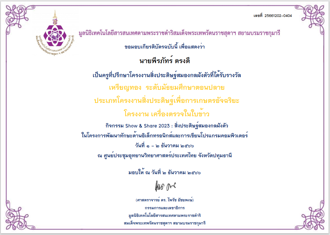 มูลนิธิเทคโนโลยีสารสนเทศตามพระราชดำริสมเด็จพระเทพรัตนราชสุดาฯ สยามบรมราชกุมารี ขอมอบเกียรติบัตรฉบับนี้ เพื่อแสดงว่า