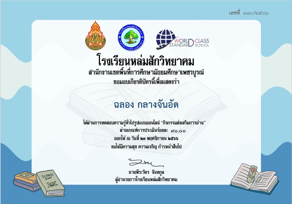 ๒๓-๐๖-๖๗ - ผ่านการทดสอบความรู้ทั่วไปรูปแบบออนไลน์"กิจกรรมส่งเสริมการอ่าน"