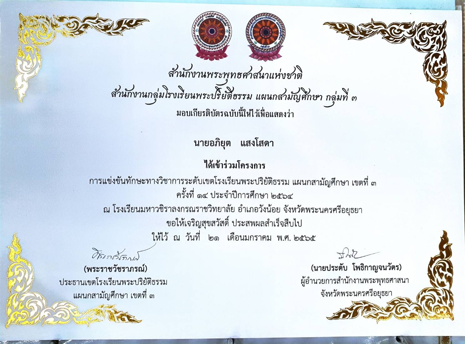 สำนักงานพระพุทธศาสนาแห่งชาติ สำนักงานกลุ่มโรงเรียนพระปริยัติธรรม แผนกสามัญศึกษา กลุ่มที่ ๓ มอบเกียรบัตรนี้ให้ไว้เพื่อแสดงว่า