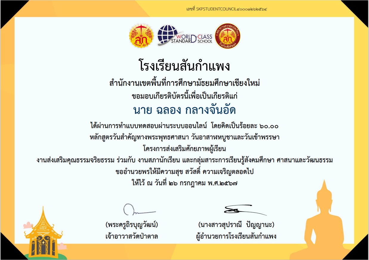 โรงเรียนสันกำแพง ขอมอบเกียรติบัตรฉบับนี้เพื่อแสดงว่า นายฉลอง กลางจันอัด ได้ผ่านการทดสอบความรู้ด้วยระบบอเล็กทรอนิกส์ เรื่อง "วันอาสาฬหบูชา และ วันเข้าพรรษา ปี ๒๕๖๗" ขอให้มีความสุข ความเจริญ และ มุ่งมั่นพัฒนาตนเองต่อไป