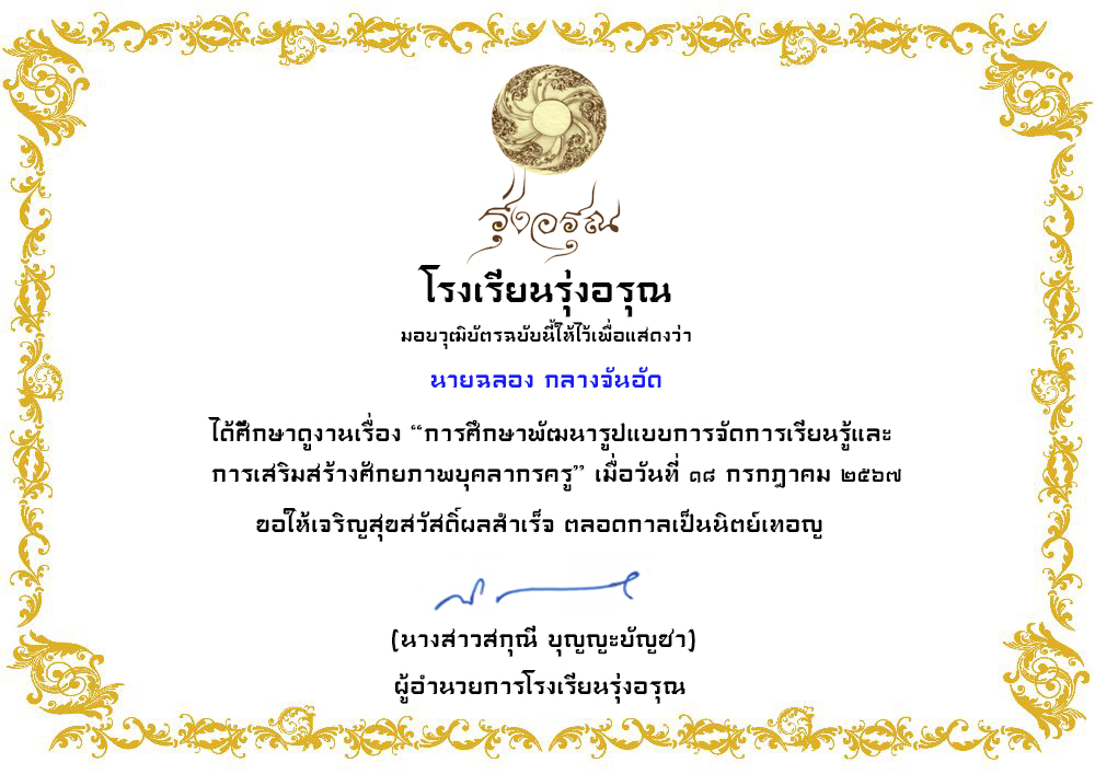 โรงเรียนรุ่งอรุณ มอบวุฒิบัตรฉบับนี้ให้ไว้เพื่อแสดงว่า อาจารย์ฉลอง กลางจันอัด