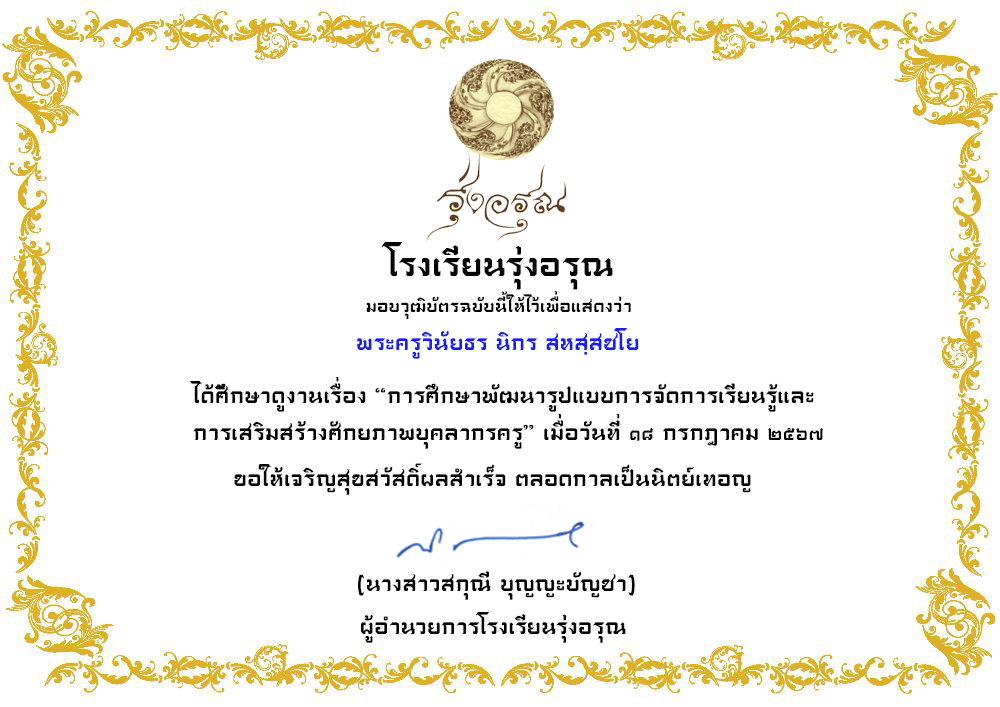 โรงเรียนรุ่งอรุณ มอบวุฒิบัตรฉบับนี้ให้ไว้เพื่อแสดงว่า พระครูวินัยธร นิกร สหสฺสชโย