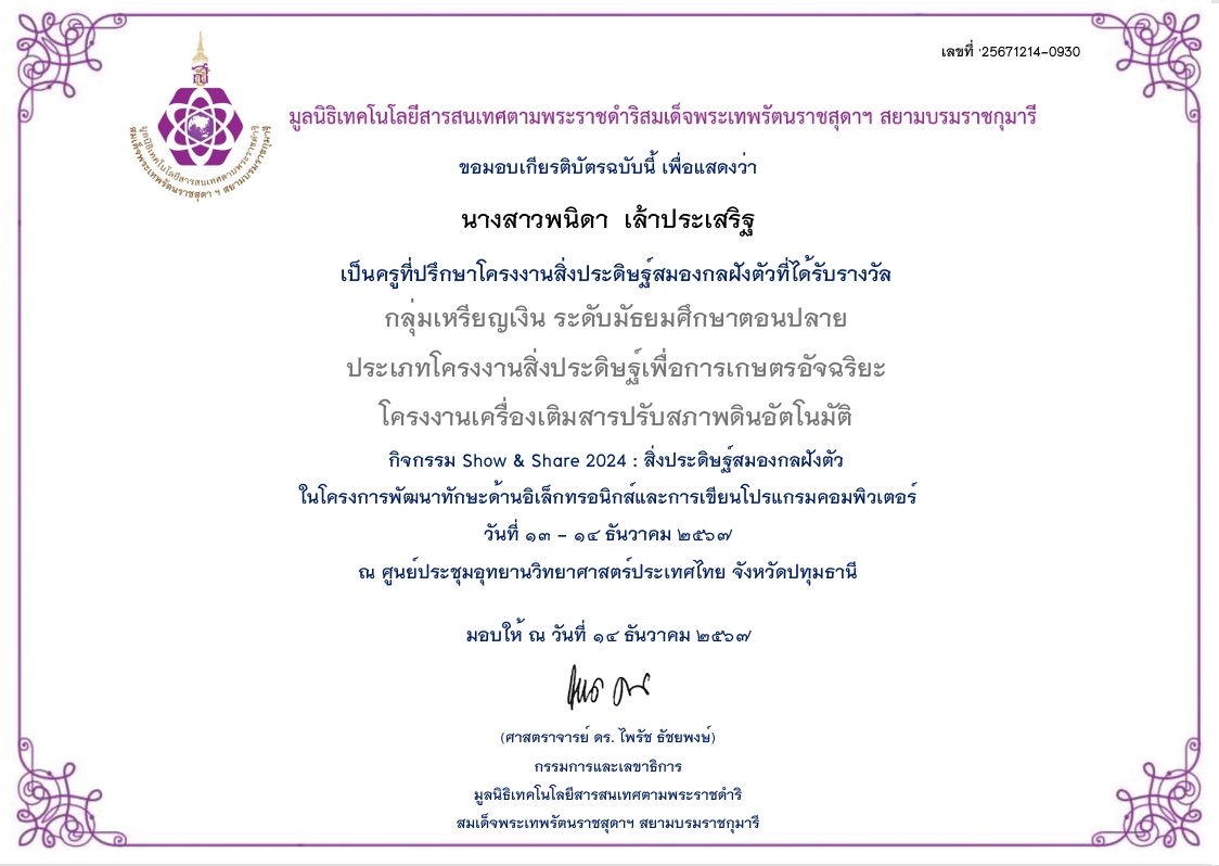 มูลนิธิเทคโนโลยีสารสนเทศตามพระราชดำริสมเด็จพระเทพรัตนราชสุดาฯ สยามบรมราชกุมารี ขอมอบเกียรติบัตรฉบับนี้ เพื่อแสดงว่า นางสาวพนิดา เล้าประเสริฐ เป็นครูที่ปรึกษาโครงงานสิ่งประดิษฐ์สมองกลฝังตัวที่ได้รับรางวัล กลุ่มเหรียญเงิน ระดับมัธยมศึกษาตอนปลาย ประเภทโครงงานสิ่งประดิษฐ์เพื่อการเกษตรอัจฉริยะ โครงงานเครื่องเติมสารปรับสภาพดินอัตโนมัติ