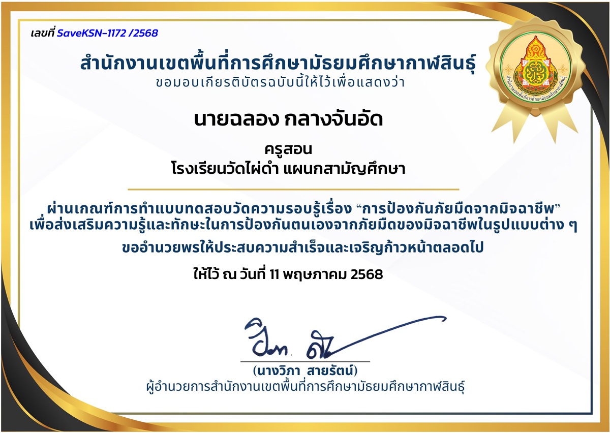 สำนักงานเขตพื้นที่การศึกษามัธยมศึกษากาฬสินธุ์ ขอมอบเกียรติบัตรฉบับนี้ให้ไว้เพื่อแสดงว่า นายฉลอง กลางจันอัด ครูสอน โรงเรียนวัดไผ่ดำ แผนกสามัญศึกษา ผ่านเกณฑ์การทำแบบทดสอบวัดความรอบรู้เรื่อง"การป้องกันภัยมืดจากมิจฉาชีพ" เพื่อส่งเสริมความรู้และทักษะในการป้องกันตนเองจากภัยมืดของมิจฉาชีพ ในรูปแบบต่างๆ ขออำนวยพรให้ประสบความสำเร็จและเจริญก้าวหน้าตลอดไป
