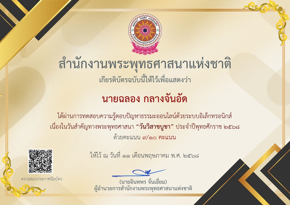 สำนักงานพระพุทธศาสนาแห่งชาติ ขอมอบเกียรติบัตรฉบับนี้ให้ไว้เพื่อแสดงว่า นายฉลอง กลางจันอัด ได้ผ่านการทดสอบความรู้ตอบปัญหาธรรมะออนไลน์ด้วยระบบอีเล็กทรอนิกส์ เนื่องในวันสำคัญทางพระพุทธศาสนา "วันวิสาขบูชา" ประจำปีพุทธศักราช ๒๕๖๘ ด้วยคะแนน ๙/๑๐ คะแนน ให้ไว้ ณ วันที่ ๑๑ เดือน พฤษภาคม พ.ศ.๒๕๖๘