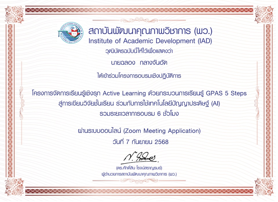 สถาบันพัฒนาคุณภาพวิชาการ(พว) Institute of Academic Development(IAD) วุฒิบัตรฉบับนี้ให้ไว้เพื่อแสดงว่า นายฉลอง กลางจันอัด ได้เข้าร่วมโครงการอบรมเชิงปฎิบัติการ โครงการจัดการเรียนรู้เชิงรุก Active Learing ด้วยกระบวนการเรียนรู้ GPAS 5 Steps สู่การเขียนวิจัยชั้นเรียน ร่วมกับการใช้เทคโนโลยีปัญญาประดิษฐ์(AI) รวมระยะเวลาการอบรม 6 ชั่วโมง