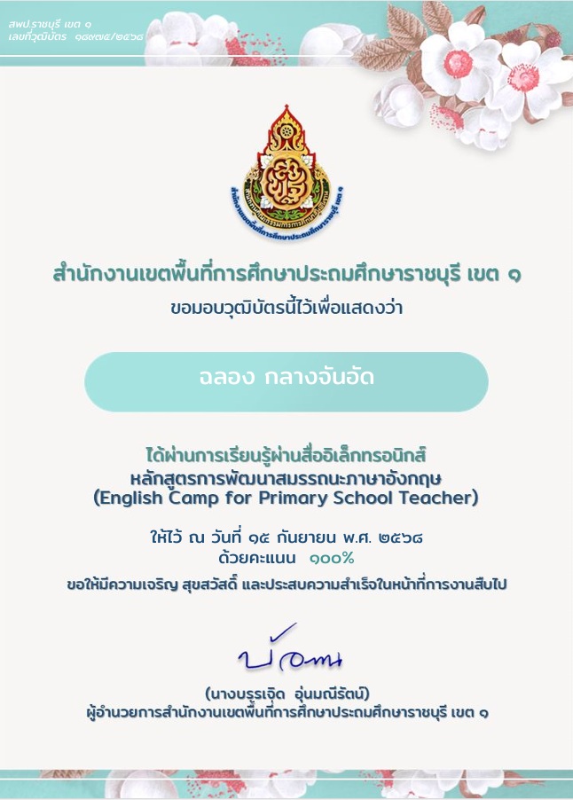 ได้ผ่านการเรียนรู้ผ่านสื่ออิเล็กทรอนิกส์ หลักสูตรการพัฒนาสมรรถนะภาษาอังกฤษ (English Camp for Primary School Teacher) ให้ไว้ ณ วันที่ ๑๕ กันยายน พ.ศ.๒๕๖๘ ด้วยคะแนน ๑๐๐ % ขอให้มีความเจริญ สุขสวัสิดิ์ และประสบความสำเร็จในหน้าที่การงานสืบไป
