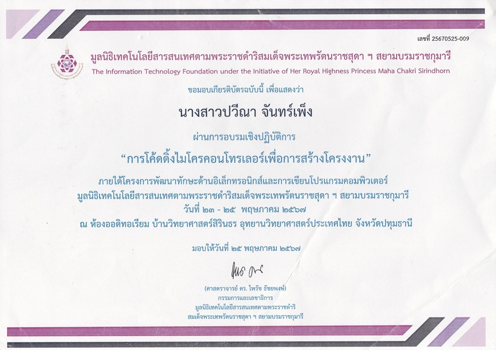 ภายใต้โครงการ พัฒนาทักษะด้านอิเล็กทรอนิกส์และการเขียนโปรแกรมคอมพิวเตอร์ เมูลนิธิเทคโนโลยีสารสนเทศตามพระราชดำริสมเด็จพระเทพรัตนราชสุดาฯ สยามบรมราชกุมารี