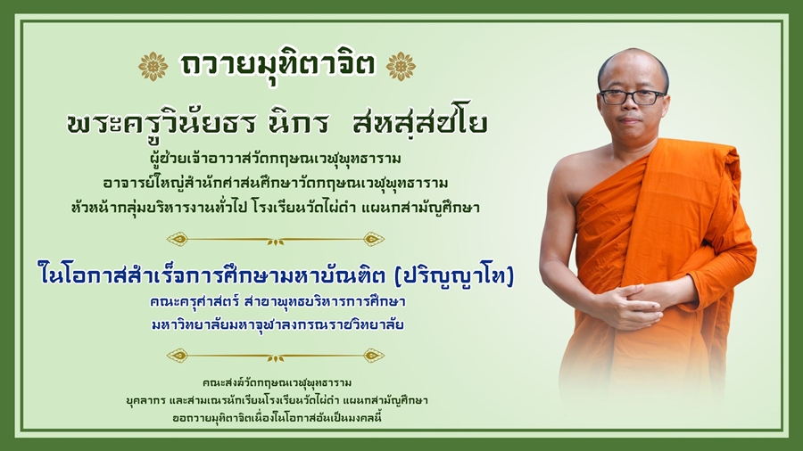 หัวหน้ากลุ่มบริหารงานทั่วไป โรงเรียนวัดไผ่ดำ แผนกสามัญศึกษา ในโอกาสสำเร็จการศึกษามหาบัณฑิต (ปริญญาโท) คณะครุศาสตร์ สาขาพุทธบริหารการศึกษา มหาวิทยาลัยมหาจุฬาลงกรณราชวิทยาลัย