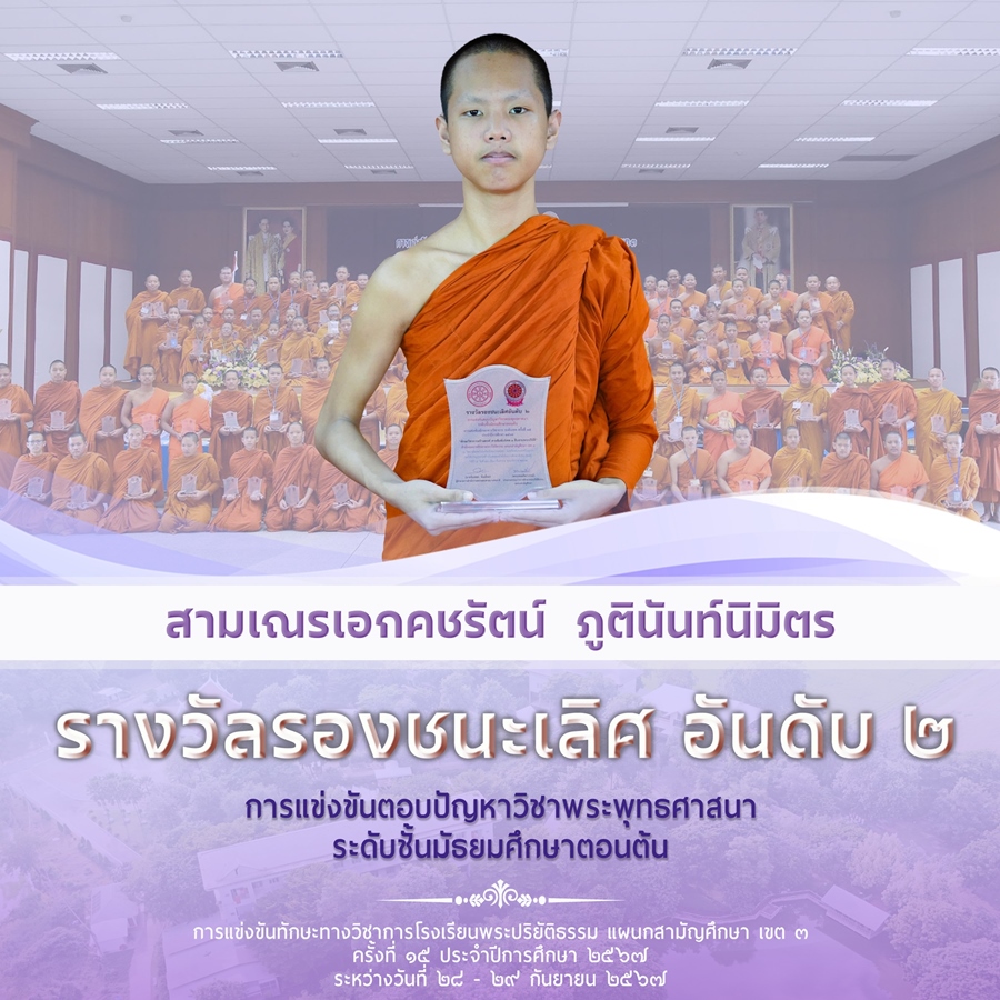 ชื่อผลงาน : รางวัลรองชนะเลิศ อันดับ ๒ การแข่งขันตอบปัญหาวิชาพระพุทธศาสนา