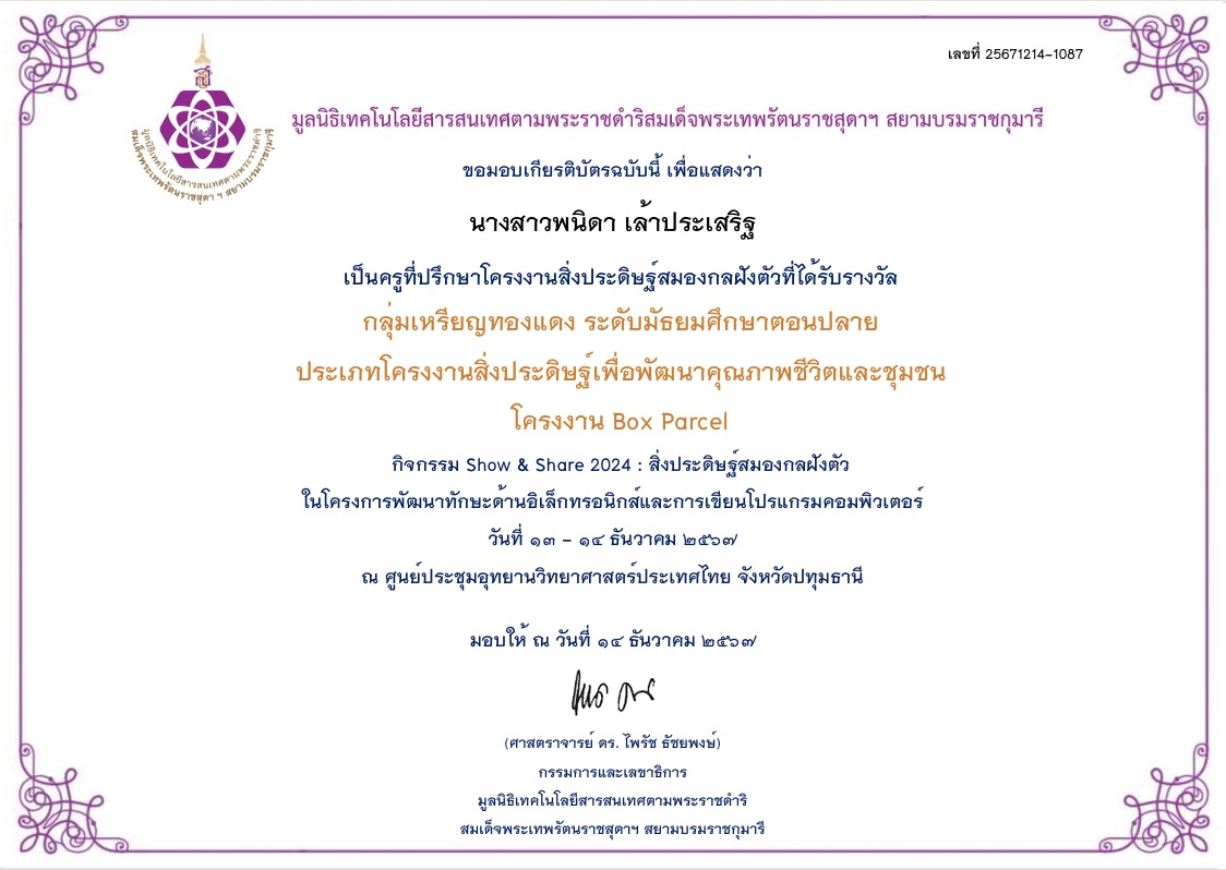 ๑๔-๑๒-๖๗ - ครูที่ปรึกษาโครงงานสิ่งประดิษฐ์สมองกลฝังตัวรางวัล เหรียญเงิน |