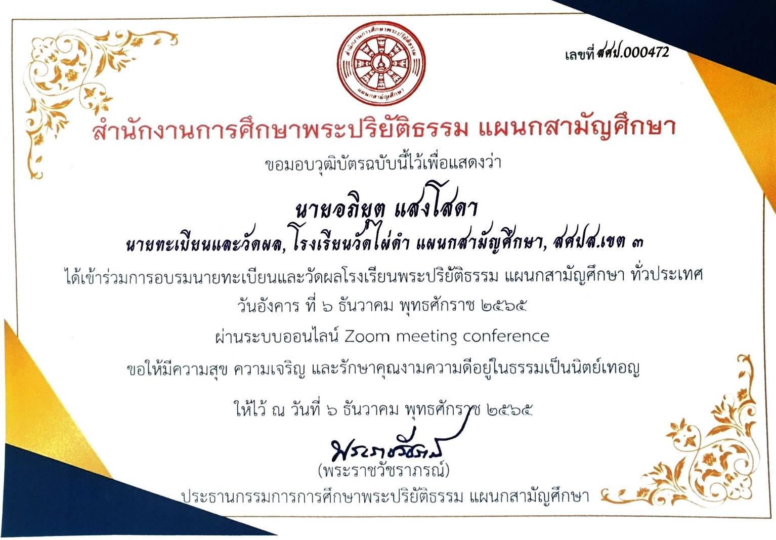 ๐๖-๑๒-๖๕ - อบรมนายทะเบียน ผ่าน Zoom meeting conference |